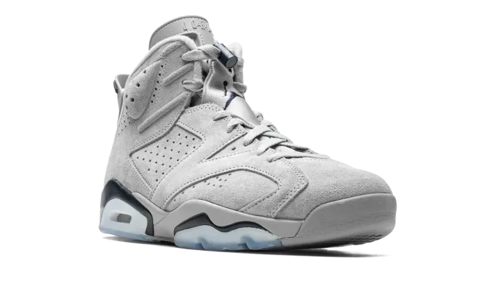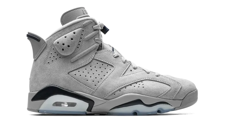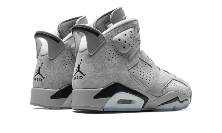 The Air Jordan 6 "Georgetown" is a clean colorway of Michael Jordan's sixth signature shoe inspired by the Georgetown Hoyas team uniforms. Although Jordan and the UNC Tar Heels defeated the Hoyas to win the NCAA Men's College Basketball Championship in 1982, that hasn't stopped Jordan Brand from using the popular basketball team's uniform colors on several great Jordan shoes, including this Jordan 6. The upper features a grey suede construction with contrasting Midnight Navy accenting on the heel "spoiler," lace toggle, and on the Jumpman on the back of the shoe. Additional navy detailing appears on the painted mudguard above the semi-translucent panel on the forefoot and heel of the midsole. Release date: September 3, 2022