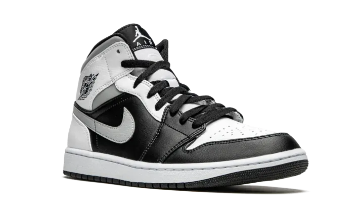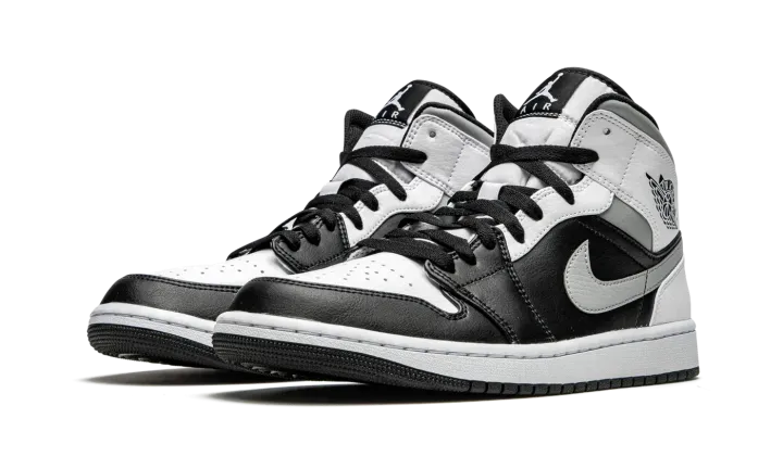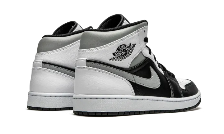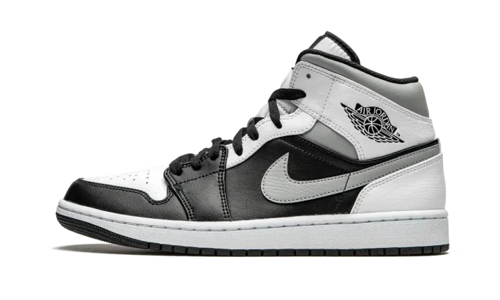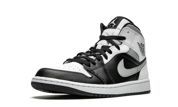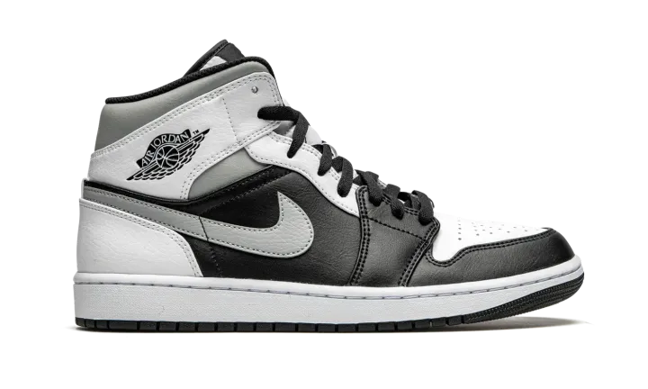 The Air Jordan 1 Mid "White Shadow" highlights the wearability of Michael Jordan's first signature shoe in its mid-top design by making use of a clean, neutral based color scheme. The upper of this "White Shadow" colorway is complete with white leather on the perforated toe, upper eyelets, collar overlay, and heel. A variety of smooth black leather is located on the forefoot overlay and mid-panel. Light Smoke Grey Swoosh branding appears on the sides and a black leather "Wings" logo resides on the collar. A white Jumpman emblem can be found on the black nylon tongue tag stitched onto the white nylon tongue. The "White Shadow" nickname is in reference to this colorway appearing similar to the original black and grey "Shadow" colorway from 1985, just with added white panels. Release date: November 27, 2020.