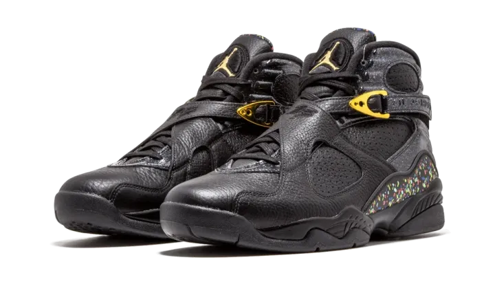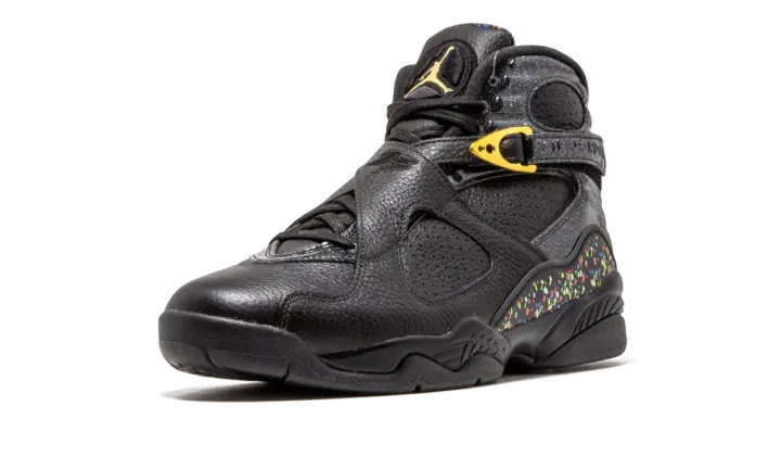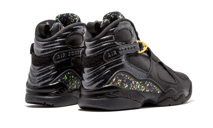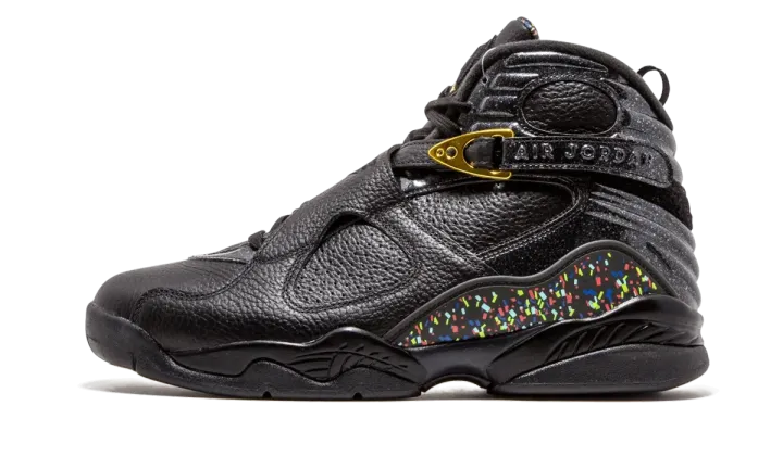 In 2016 Jordan Brand changed up the theme for the Air Jordan "Championship Pack" from "Champagne & Cigar" to "Trophy & Confetti" for the Air Jordan 8 representing Michael Jordan's Finals victory in 1993 with the Bulls. Here we have the "Confetti" colorway, featuring a full-grain black leather upper with a confetti graphic on the TPU paneling and outsole.
