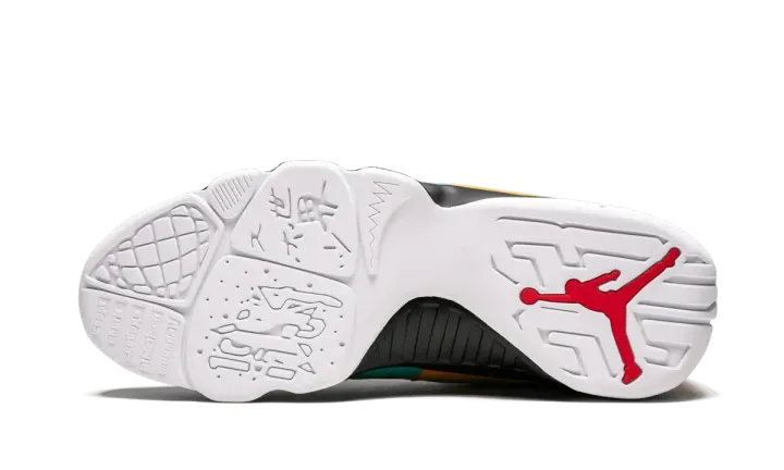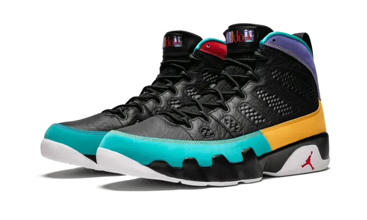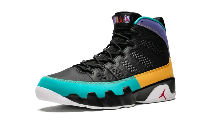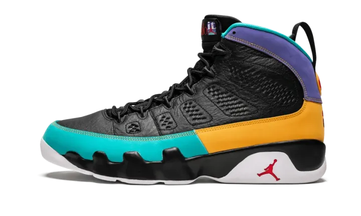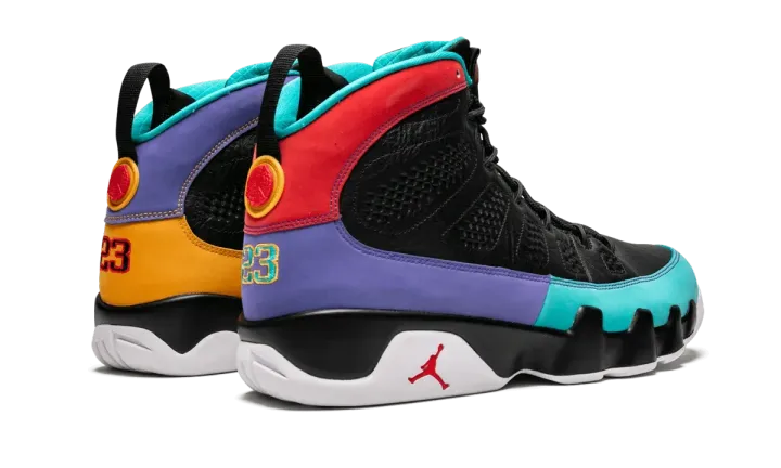 The Air Jordan 9 "Dream It, Do It" is a special edition of the ninth Michael Jordan signature shoe inspired by the '90s. The colorful look references the original 1994 ad campaign for the Air Jordan 9, which flipped Nike's classic "Just Do It" slogan to "Dream It, Do It." The unique construction on this Jordan 9 features a black leather base with mismatched multi-color panels on opposite feet in purple, yellow, red, and aqua nubuck. A "Dream It, Do It" patch is added to the tongue to complete the theme. The Air Jordan 9 "Dream It, Do It" released on March 9, 2019.