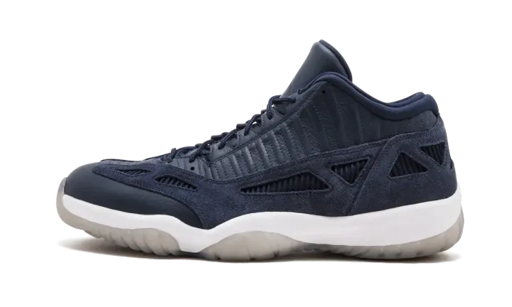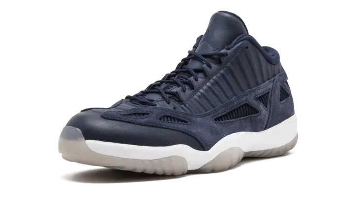 The Air Jordan 11 Low IE "Obsidian" is lifestyle colorway of the classic low-top version of Michael Jordan's eleventh signature shoe. This silhouette was worn by Jordan during stretches of the '96 NBA Playoffs and features several modifications in comparison to the high-top Jordan 11. A buttery soft Obsidian suede mudguard replaces the patent leather design found on the original Air Jordan 11. Tonal leather dots the collar and blush corduroy is visible along the mid-panel. Tonal leather covers the toe and tongue, which features an embroidered Jumpman logo. The look is finished off with a white midsole and translucent outsole.