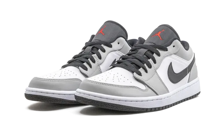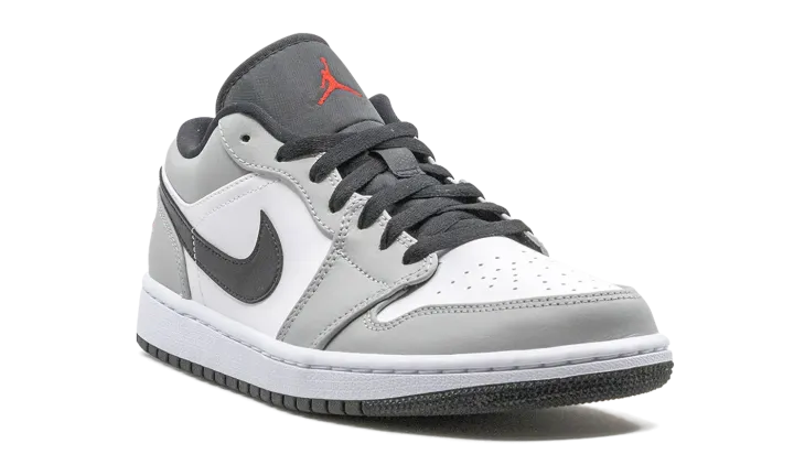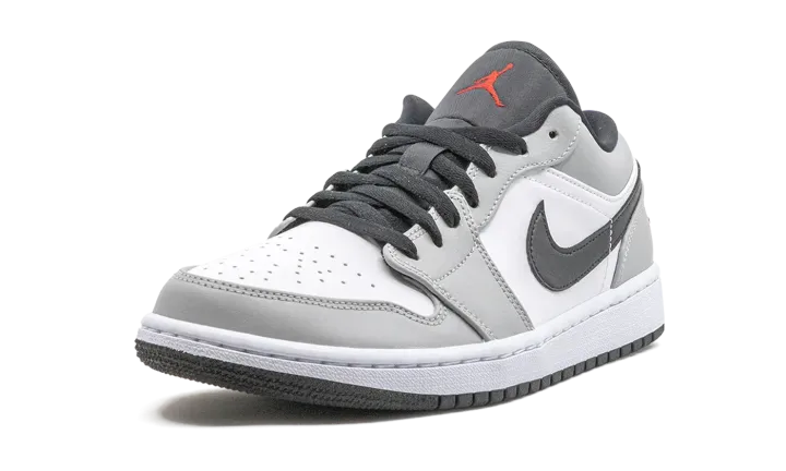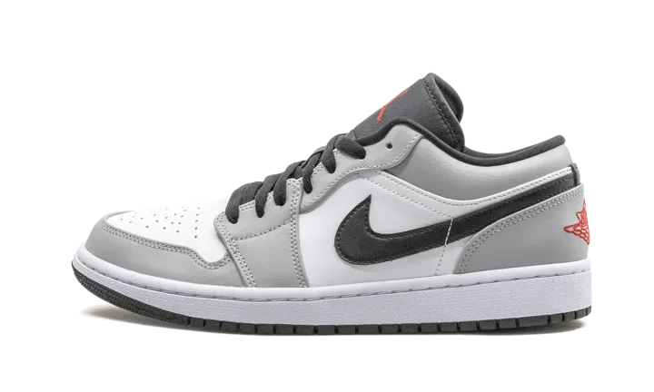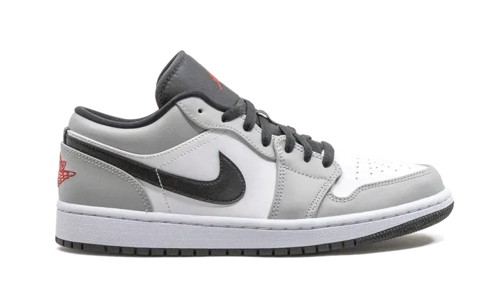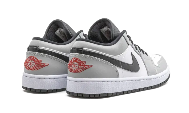 The Air Jordan 1 Low "Light Smoke Grey" features a neutral look that highlights the versatility of Michael Jordan's iconic first signature shoe in low-top form. The Jordan 1, one of streetwear's most popular sneakers of choice, adds a vintage flair to your collection with a timeless design. The same ethos underpins this "Light Smoke Grey" edition. Smooth white leather covers the perforated toe and mid-panel. Light Smoke Grey leather overlays on the forefoot, eyelets, collar, and heel add subtle contrasting to the appearance of the shoe. A black leather Swoosh dots the mid-panel and red embroidered "Wings" and Jumpman detailing appear on the heel and black nylon tongue, respectively. Release date: November 27, 2020.