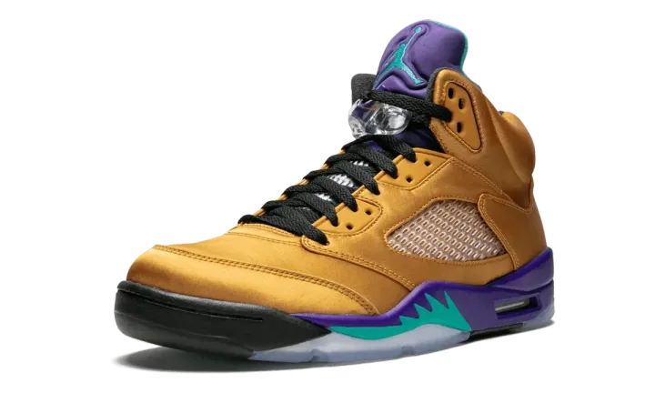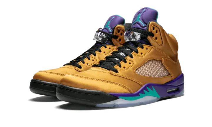 The Air Jordan 5 "Fresh Prince - Friends & Family" is an incredibly rare edition of the classic silhouette made only for Will Smith's inner circle. Produced in conjunction with the laceless retail version to honor Smith's 50th birthday, this version of the Jordan 5 features a more traditional construction with laces, but outfits the upper in shiny metallic gold satin. Other than the gold satin replacing the white leather, the rest of the "Grape" colorway is intact, except for a slight tweak of the red Jumpman logos on each heel. With only 25 pairs of the Air Jordan 5 "Fresh Prince - Friends & Family" rumored to exist, this is a true grail for Air Jordan collectors and fans of the iconic TV series.