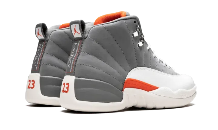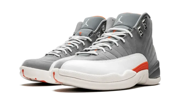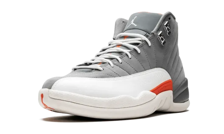 This "Cool Grey" version of the Air Jordan 12 Retro from 2012 features a grey nubuck upper with white accents to complete the original color block, then accented with orange.