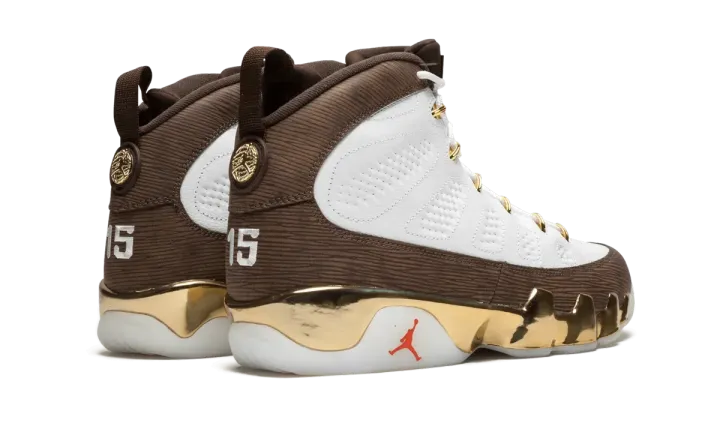 Carmelo Anthony played just one season for Syracuse, in 2003, but it was a memorable one. In 2018 Jordan Brand celebrated Carmelo Anthony's national championship-winning season with the Air Jordan 9 Melo "MOP". Utilizing one of Anthony's favorite Air Jordan silhouettes, the sneakers pay tribute to the Most Outstanding Player award that he won after leading the Orangemen to the national title as a freshman. The Air Jordan 9 Melo "MOP" features a white leather base with woodgrain-textured paneling and metallic gold details.