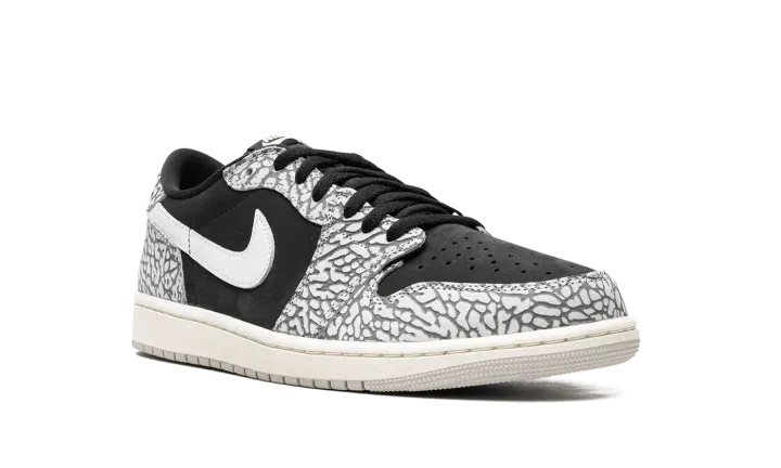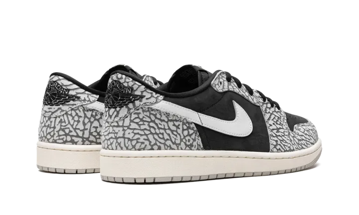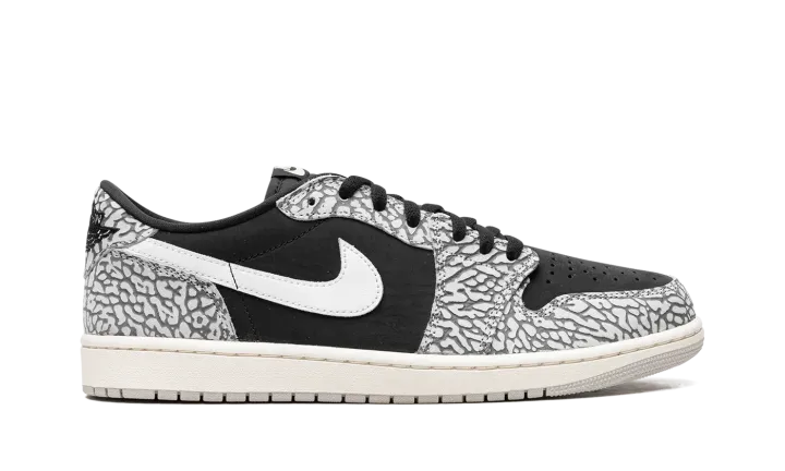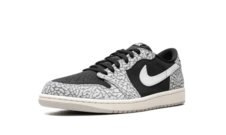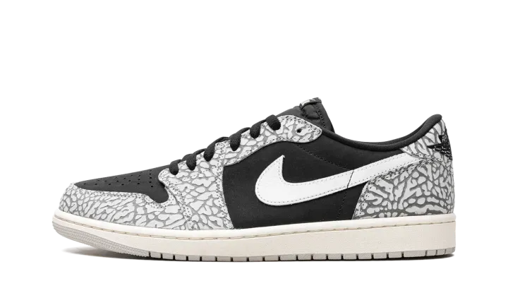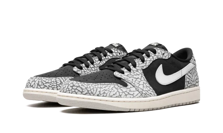 The Air Jordan 1 Low OG "Black Elephant" is a colorway of the vintage basketball shoe that incorporates a classic patterning of the Air Jordan 3. From Jordan Brand's "Elephant" collection, the "Black Elephant" iteration of the Jordan 1 Low OG nods to the Air Jordan 3 by featuring its iconic elephant print on its overlay panels. The shoe's base is designed in black leather. A white leather Swoosh is found on either side. Classic "Wings" and "Nike Air" logos appear on the heel and tongue tag, respectively. Release date: June 23, 2023