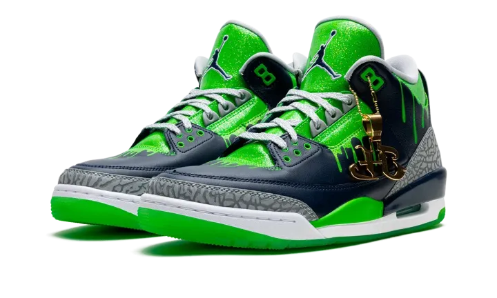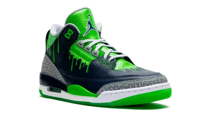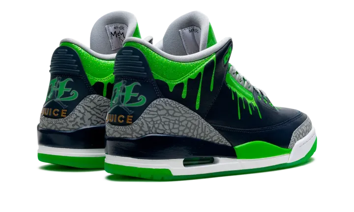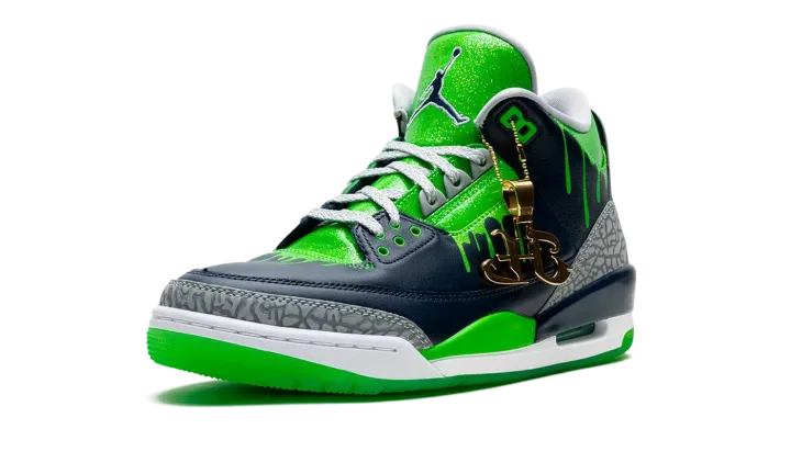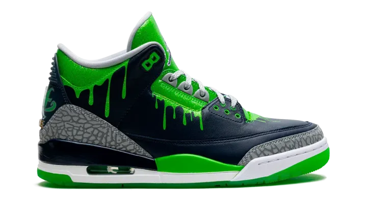 The Doernbecher x Air Jordan 3 "Hugo" is a special colorway released as part of Nike's Doernbecher Freestyle collection with Doernbecher Children's Hospital in 2023. The Jordan 3 "Doernbecher" is designed by Hugo Covarrubias Molina, and is inspired by his favorite football team, the NFL's Seattle Seahawks. The team's colors are found on the design, giving the sneaker an eye-catching appearance. Specifically, the upper features a dark navy leather base and grey elephant print overlays. A unique drip pattern in a neon green hue with sparkles appears throughout the design. Hugo's own signature branding can be found on the translucent heel counter, along with a Jumpman and Hugo's nickname, "Juice." Other details include glow-in-the-dark laces, and a green-tinted translucent outsole with the phrase "It's OK to be different." A gold-plated hangtag completes the look. Release date: December 2, 2023