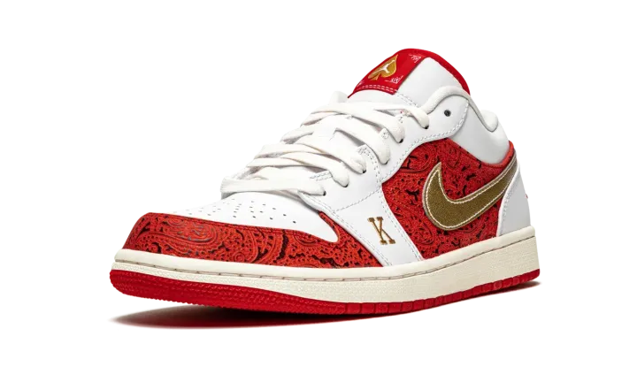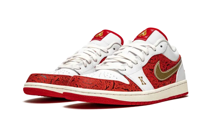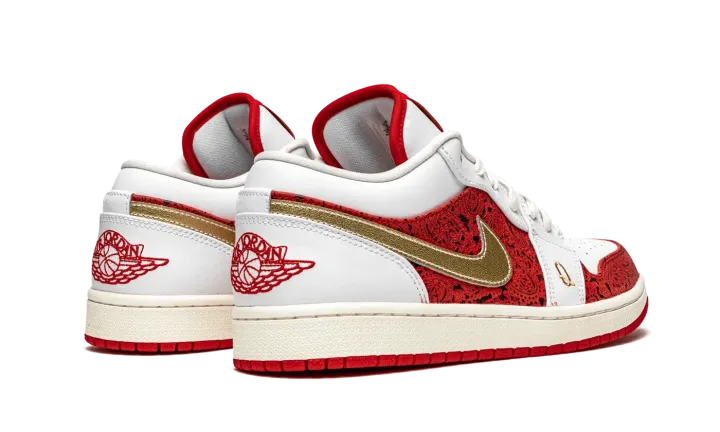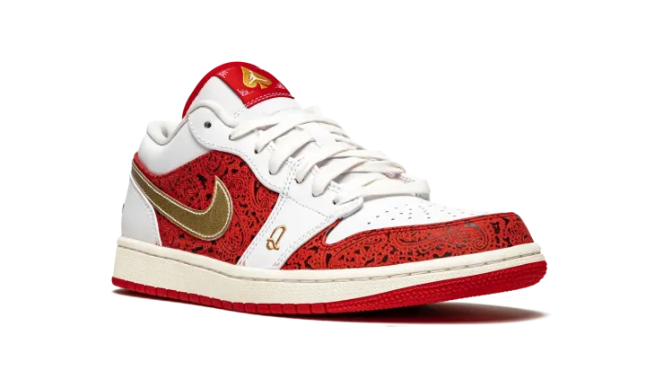 The Air Jordan 1 Low SE "Spades" is a unique colorway of Michael Jordan's first signature shoe inspired by playing cards. Constructed on the always-in-style low-top Jordan 1, the "Spades" exudes a luxury influence with lavish red-and-black leather detailing inspired by the background of a playing card on the toe cap and mid-panel. Jordan Brand goes as far as to embroider a gold "K" and "Q" on the white leather forefoot overlay on the left and right shoe, respectively. The letters represent the king and queen cards found in a deck of cards. Moreover, a gold spade graphic resides on the red tongue tag on the white leather tongue. Metallic gold leather Swooshes on either side combine with a red embroidered "Wings" logo on the heel to give the Air Jordan 1 Low SE "Spades" a classic, retro-inspired look. Release date: May 27, 2021.