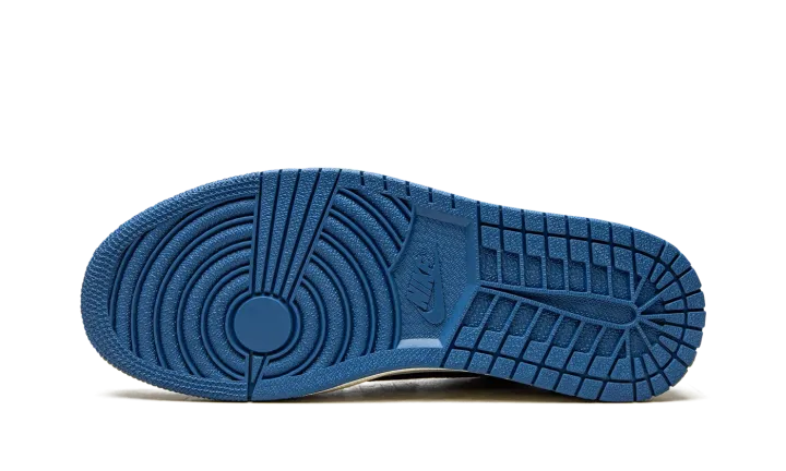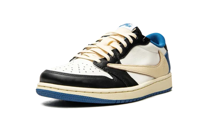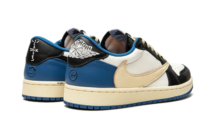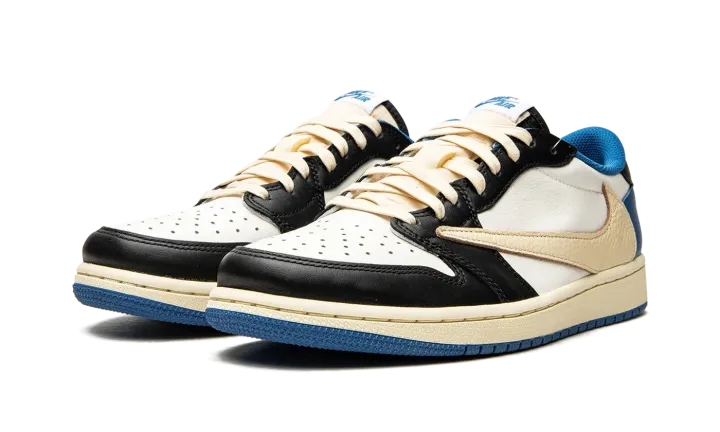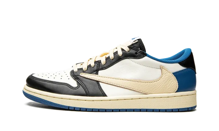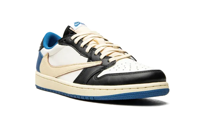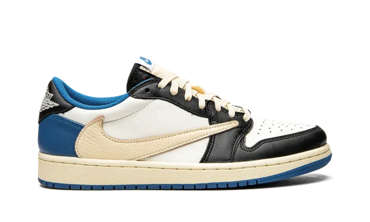 The Travis Scott x Fragment x Air Jordan 1 Low OG is a three way collaboration between the hip-hop star, the Japanese streetwear brand, and Jordan on the low-top iteration of Michael Jordan's first signature shoe. Joining an Air Jordan 1 High OG, the Travis Scott and Hiroshi Fujiwara-designed Jordan 1 Low OG fuses the singular aesthetic of the rapper and fashion designer onto a progressive design of the retro basketball shoe. Sail leather appears on the perforated toe and mid-panel. Contrasting black tumbled leather graces the toe cap, forefoot, and eyelets. The two-tone white-and-black color block mimics the color cadence of the Air Jordan 1's original "Black Toe" colorway. The oversized cream leather Swoosh is a nod to the styling of Scott's first Air Jordan 1 collaboration from 2019. Dual "Cactus Jack" and "Wings" embroidery appear on the heel of the left and right shoe, respectively. Further, Scott's "face" motif and Fragment's "lightning bolt" imagery are embossed on the left and right shoe, respectively, as well. Classic "Nike Air" branding is printed in blue on the white nylon tongue tag. The Travis Scott x Fragment x Air Jordan 1 High OG "Military Blue" is one of the most desirable sneaker releases of 2021. Release date: August 13, 2021