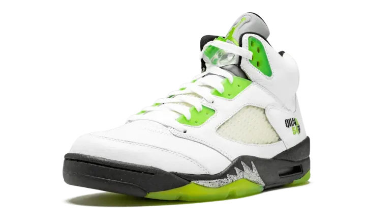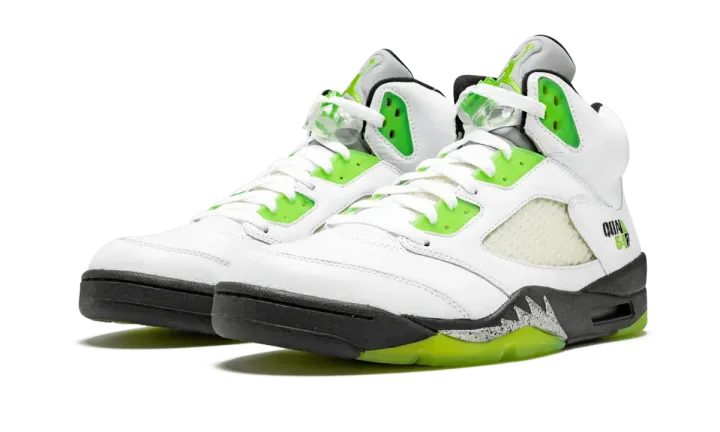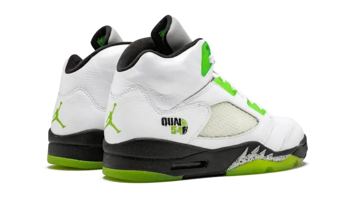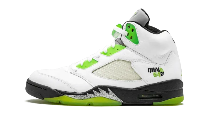 Released in 2011 for the annual Quai 54 streetball tournament in Paris, this Air Jordan 5 features a bold colorway with a white leather base and neon green and black accents. Quai 54 logos are found on each heel to complete this highly limited edition of the Air Jordan 5.