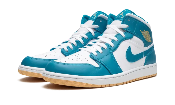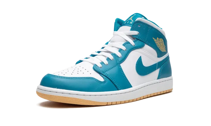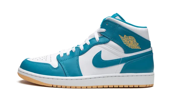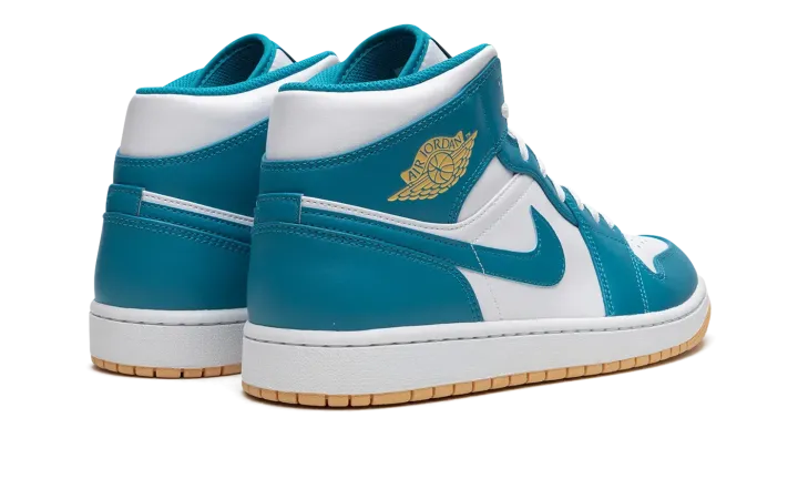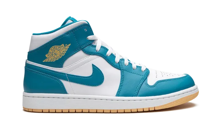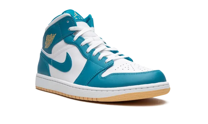 The Air Jordan 1 Mid "Aquatone" is a colorway of the mid-top lifestyle shoe with a can't-miss design. A release from Jordan Brand's Spring 2023 collection, the "Aquatone" Jordan 1 Mid features a white leather base with Aquatone leather overlays and leather Swoosh branding. A gold "Wings" logo appears on the collar, and a gold Jumpman can be found on the aqua-colored tongue tag. The shoe is mounted on a white rubber midsole and gum outsole. Release date: April 11, 2023