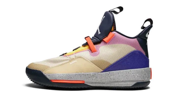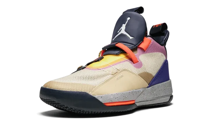 The Air Jordan 33 "Visible Utility" is a limited edition colorway of the performance basketball shoe inspired by the classic Nike ACG line. The Desert Ore mesh upper with black, purple, yellow, and orange accents and a grey speckled midsole calls back to early 1990s Nike ACG outdoor footwear and apparel. While the inspiration for the colorway is retro, the shoe itself is a modern performance masterpiece with a cutting edge laceless FastFit enclosure system that locks your foot in by simply pulling up on the forefoot strap. The sole features Jordan Brand's Flight Speed technology utilizing Zoom Air cushioning and a carbon fiber plate that supports the foot and provides a springy feel. The Air Jordan 33 "Visible Utility" released in November 2018.