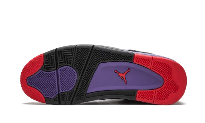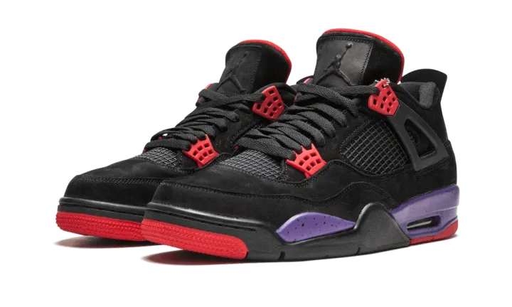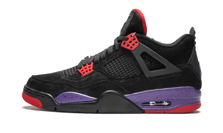 In 2018 Jordan Brand took the original black, purple, and red palette from the Air Jordan 7 and used it to create the Air Jordan 4 "Raptors." The fierce colorway was rumored to be designed by Drake, drawing inspiration from his beloved Toronto Raptors. The Air Jordan 4 "Raptors" has a premium black suede construction with a purple speckled midsole and bright red accents.