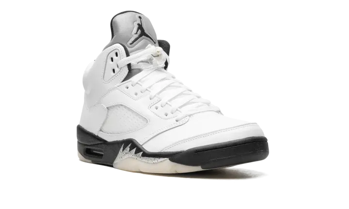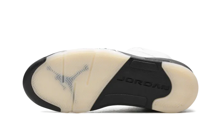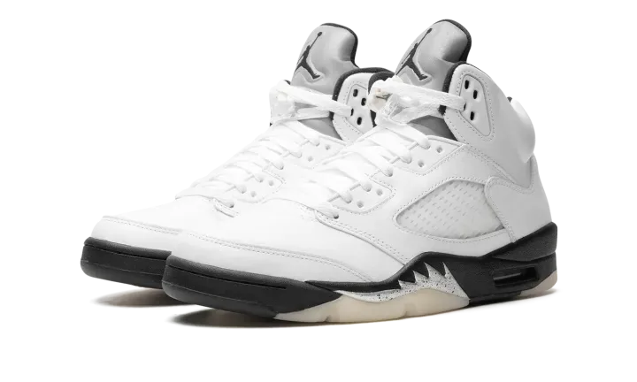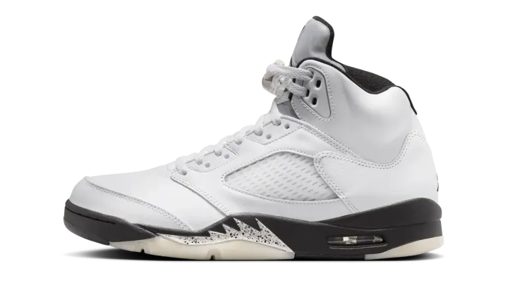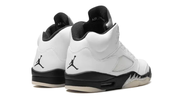 The Air Jordan 5 "White/Black" is a monochrome iteration of the classic Air Jordan silhouette that originally came out in 1990. The iconic design elements of the Jordan 5 such as the metallic tongue, lace toggle, translucent outsole, and fighter plane-inspired elements on the midsole, look incredibly sleek and clean in this "White/Black" colorway.