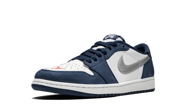 The Nike SB x Air Jordan 1 Low "Eric Koston" is a collaborative release of the low-top Jordan 1 by Nike's skateboarding division designed by longtime team rider Eric Koston. The skate legend and avid sneaker collector puts his own touch on the Jordan 1 Low, featuring a clean look in white leather and navy blue suede with metallic silver Swooshes. Koston adds a Jumpman logo to the toe box in red embroidery. Each pair also features the classic Jordan wings logo on the heel and a Nike SB logo on the tongue tag. The Nike SB x Air Jordan 1 Low "Eric Koston" released during the summer of 2019.