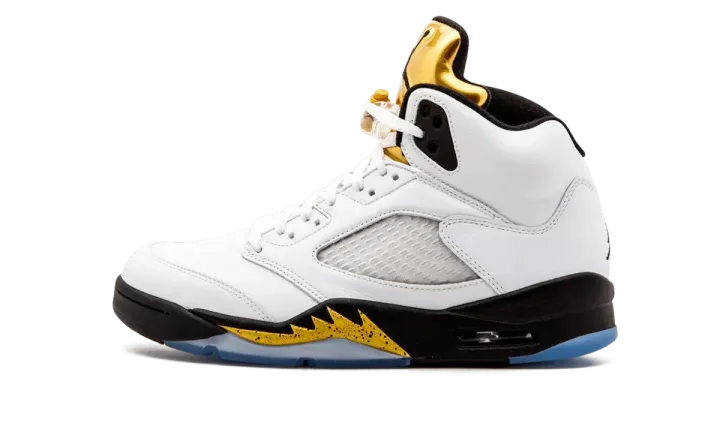 Released in celebration of the summer Olympics of 2016, this Air Jordan 5 takes first place with the "Gold Tongue" colorway. The clean look features a white leather upper with a metallic gold tongue and black accents.