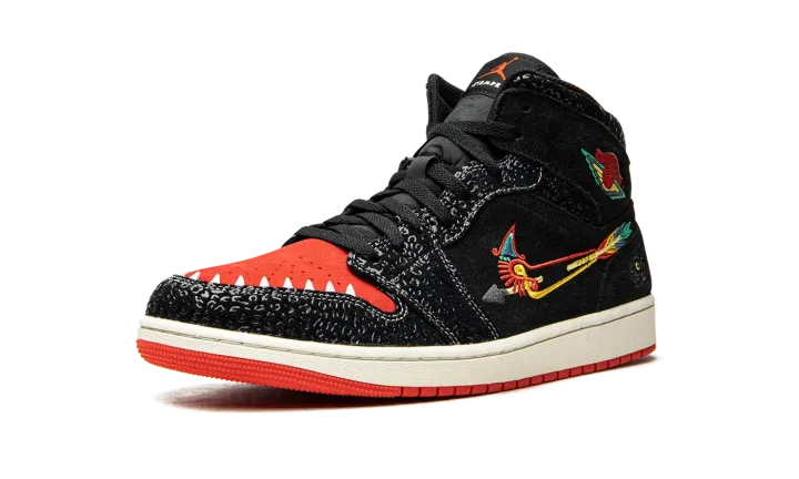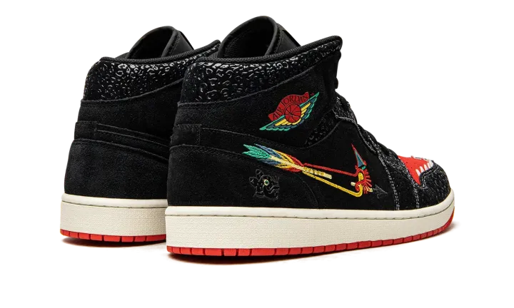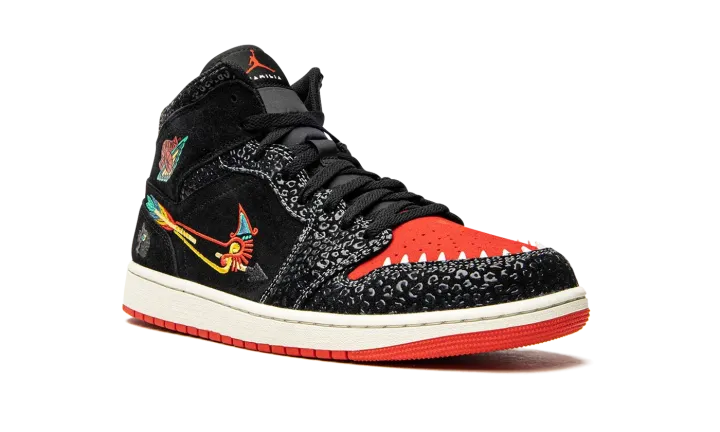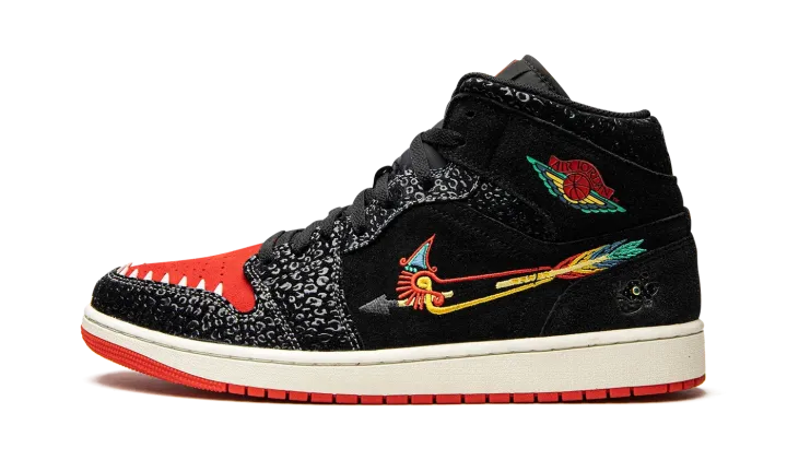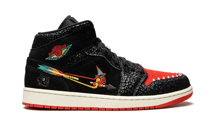 The Air Jordan 1 Mid SE "Siempre Familia" is a special edition of the classic basketball shoe released as part of Nike's "Dia de los Muertos" collection honoring the traditional Mexican holiday. A creative look for the Air Jordan 1 Mid, the "Siempre Familia" is a colorway inspired by Mictlán, the underworld of Aztec mythology that spans nine levels. Details include animal-inspired graphics and prints that reference those that usher one into the afterlife. The upper features a predominantly black appearance with unique details such as textured overlays and a modified bow-and-arrow-style Swoosh. The "Wings" logo is designed in a multicolor look inspired by "Dia de los Muertos." Jaguar-inspired teeth border the red perforated toe box. Release date: October 29, 2021