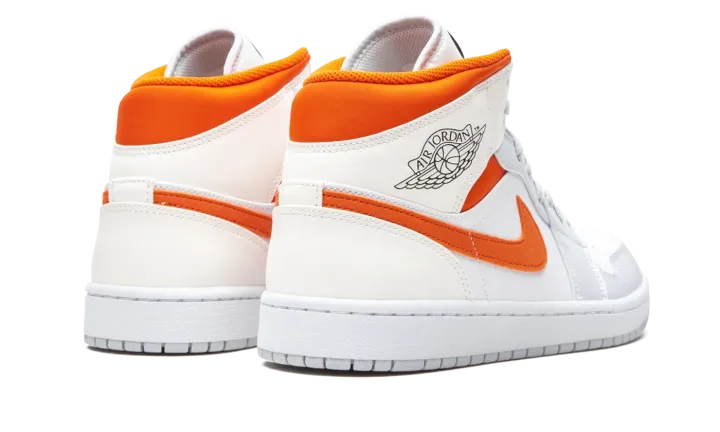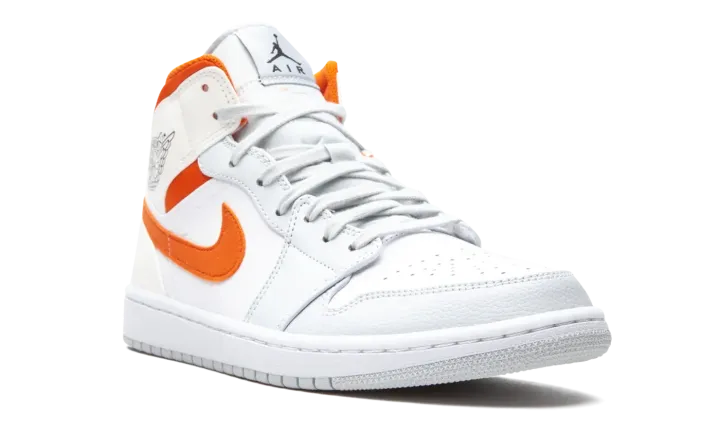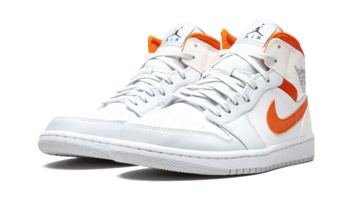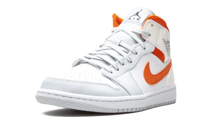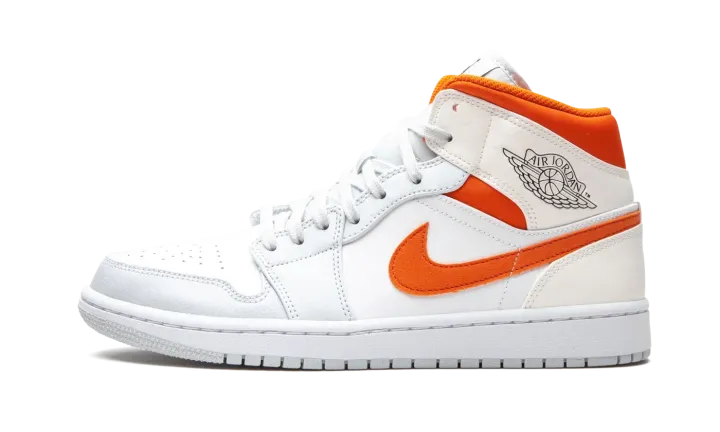 The Air Jordan 1 Mid "Starfish" is a refined look for the mid-top version of Michael Jordan's first signature shoe. A February 2020 release from Jordan Brand, the "Starfish" colorway of the popular Air Jordan 1 model is a subtle nod to a classic and very rare shoe in Michael's footwear line: the Jordan 1 High "Metallic Orange." The "Starfish" doesn't feature any metallic leather detailing like the "Metallic Orange," though its blazing accenting does evoke a certain nostalgic feeling. Crisp white leather can be found on the perforated toe and mid-panel. Contrasting Pure Platinum leather overlays appear on the forefoot, eyelets, and toe cap. Both the nylon tongue and laces are finished off in the same shade of grey. A Starfish leather Swoosh logo appears on either side of the shoe. The fiery orange hue is used on the collar and sock liner. Final details include black Jumpman branding on the nylon tongue tag and black outline "Wings" detailing on the collar. Release date: February 2020.