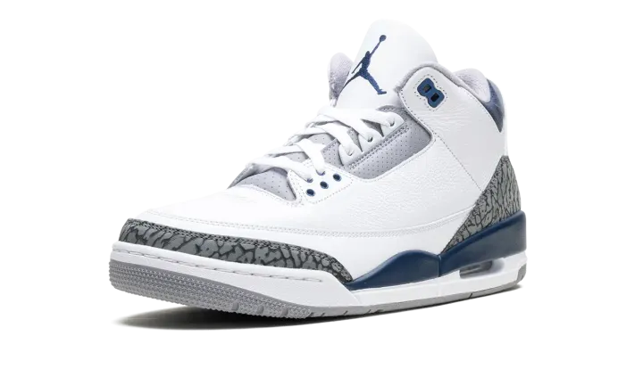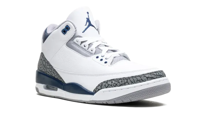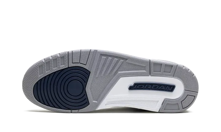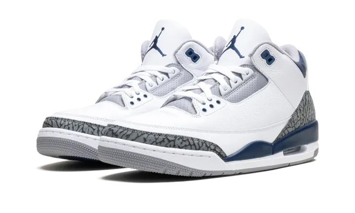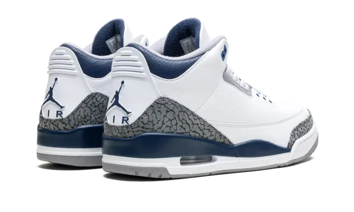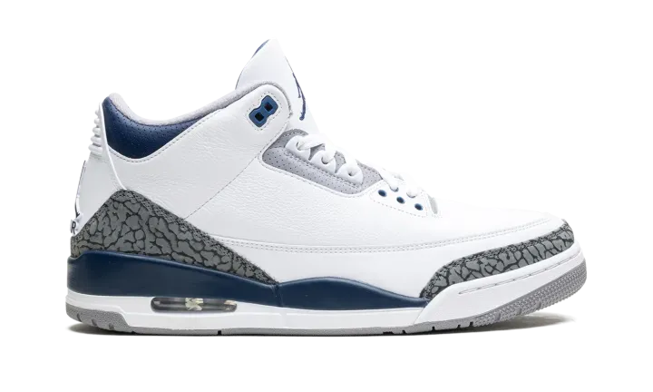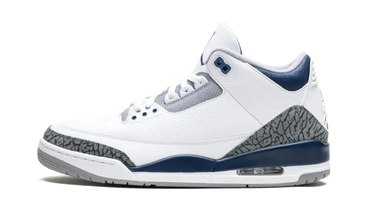 The Air Jordan 3 "Midnight Navy" is a colorway of the retro basketball shoe with navy accents. Michael Jordan's third signature shoe in the "Midnight Navy" colorway features a white leather upper with elephant print overlays on the toe and heel. A Midnight Navy-colored mudguard contrasts the look, as do the Midnight Navy eyelet holes. More Midnight Navy accenting is featured on the Jumpman on the white leather tongue and on the Jumpman on the heel. The white midsole has a visible Air bubble in the heel. A grey rubber outsole completes the look. Release date: January 13, 2024