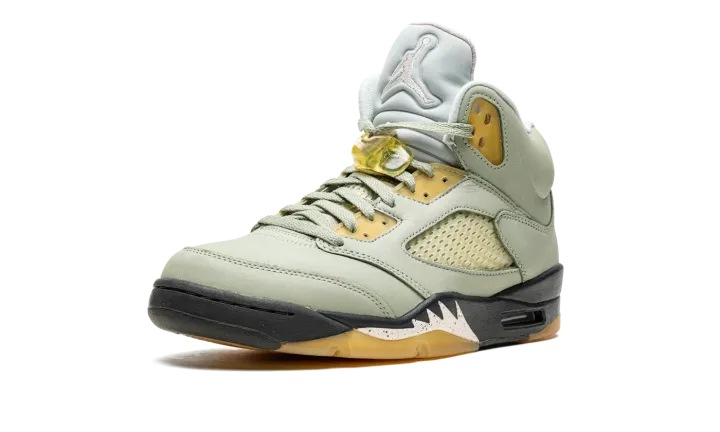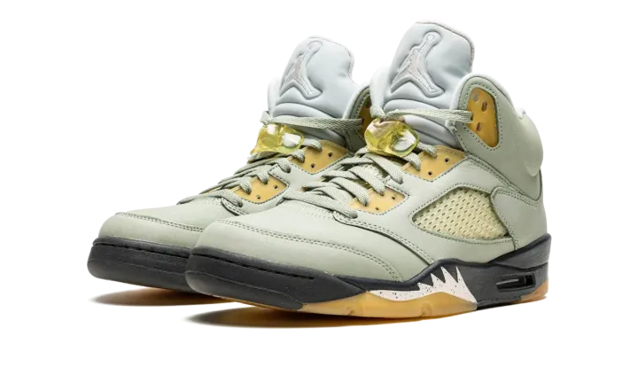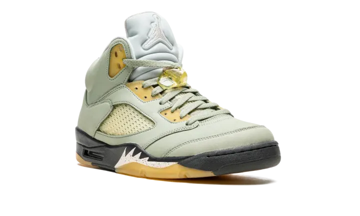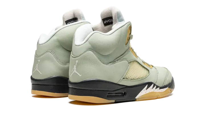 The Air Jordan 5 "Jade Horizon" is a March 2022 release of Michael Jordan's vintage basketball shoe in a colorway with unique, retro-inspired details. A versatile look for the popular, old school basketball and lifestyle shoe by Jordan Brand, the Jordan 5 in "Jade Horizon" has a Jade Horizon-colored leather construction. The eyelet panels, lace toggle, and outsole feature a vintage-inspired, oxidized appearance. A white Jumpman is embroidered on the silver reflective tongue that shines when exposed to light in the dark. Moreover, a white Jumpman is embroidered on the heel. Finishing touches include a black painted midsole with white "shark tooth" detailing with black speckling on the forefoot. Release date: March 25, 2022