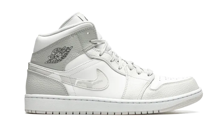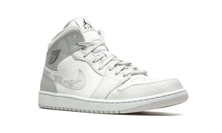 The Air Jordan 1 Mid "White Camo" features a neutral aesthetic that can be worn with virtually anything in your wardrobe. Appearing in the alternate mid-top version of Michael Jordan's first signature shoe, the "White Camo's" upper displays tumbled leather overlays in grey. Smooth white leather can be found on the mid-panel, perforated toe, and collar. A subtle white and grey camouflage Swoosh dots either side of the shoe. Additional branding appears in the form of a black "Wings" logo on the collar, and black Jumpman insignia on the white nylon tongue tab.