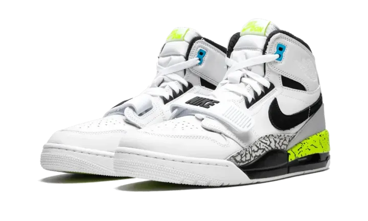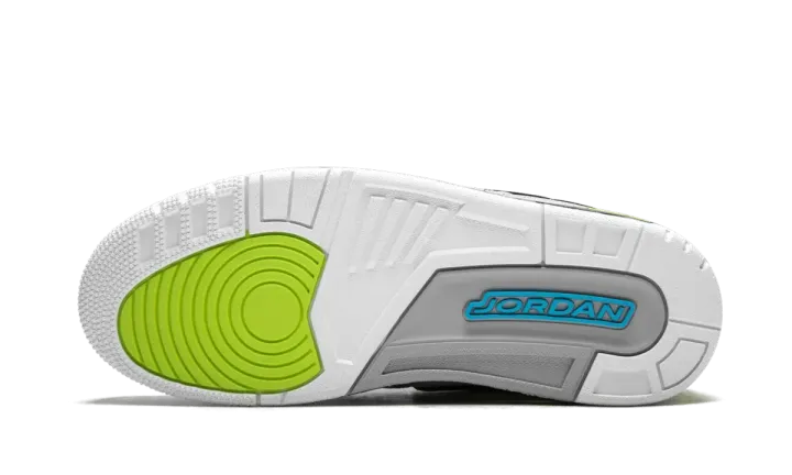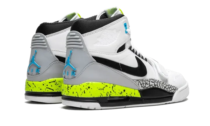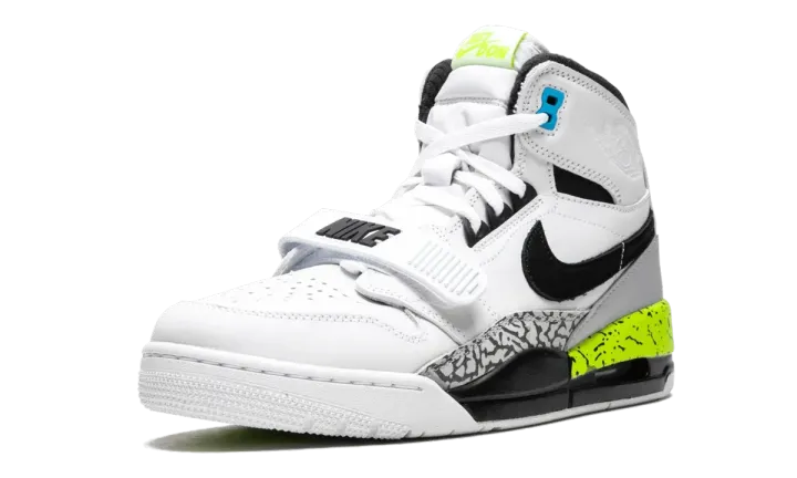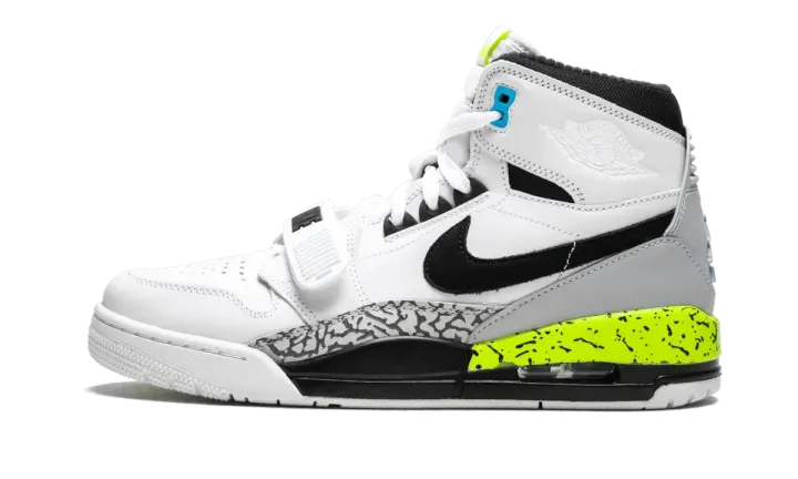 Luxury sportswear designer Don C teamed up with Jordan Brand again in 2018, when he got the honor of creating his very own silhouette. The Jordan Legacy 312 pays homage to a few of Don C's favorite basketball shoes. The design features elements from the Air Jordan 1 and Air Jordan 3, while also incorporating pieces from two Nike basketball models, the Air Force STS and the Air Alpha Force Low. This version also works in a fifth beloved Nike hoops shoe, with the colorway coming from the Air Command Force. The Jordan Legacy 312 "Volt" replicates the white, black, bright blue, and volt colors of the Air Command Force, right down to the speckled midsole.