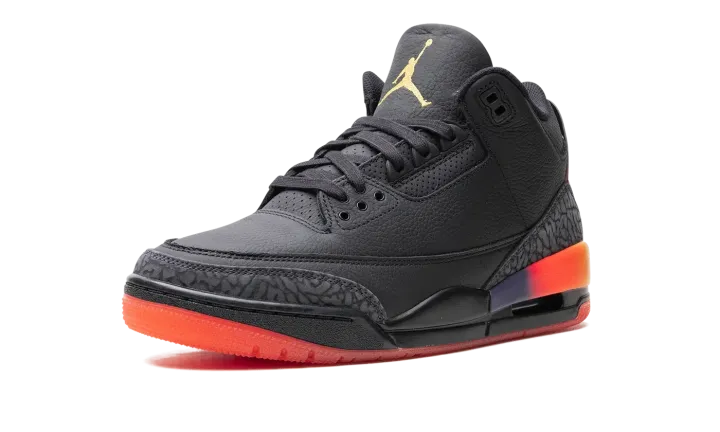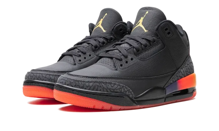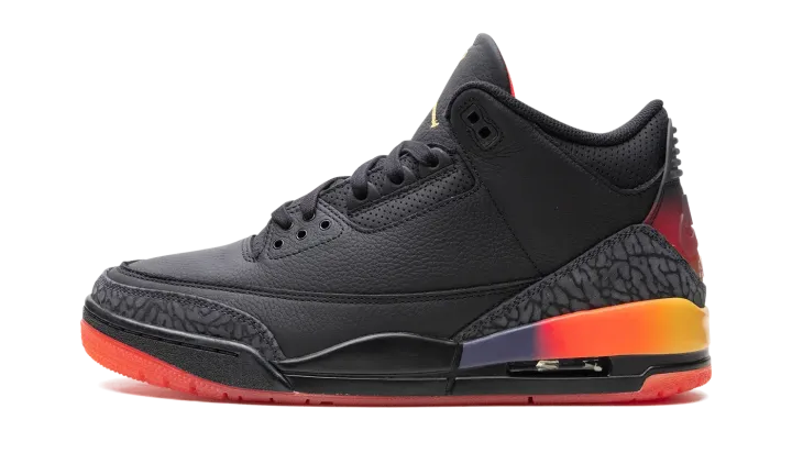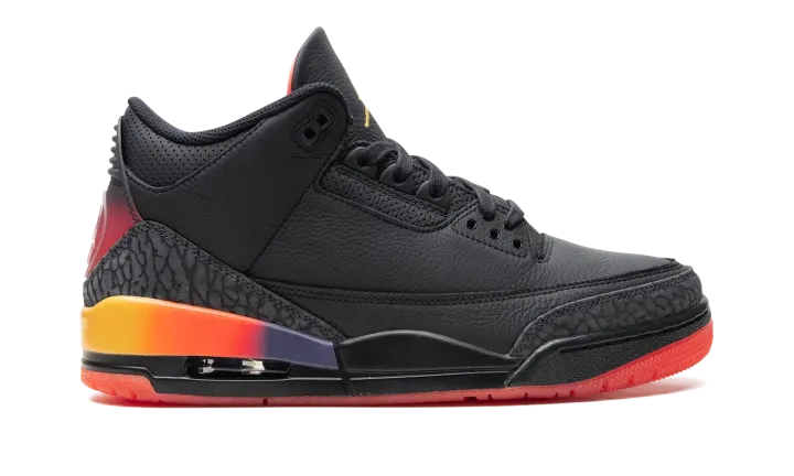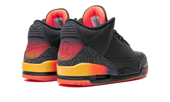 The J Balvin x Air Jordan 3 "Rio" is a collaboration by the popular recording artist on a colorway of the classic Jordan sneaker inspired by his son, Rio. J Balvin and Jordan Brand have worked together on colorways of the Air Jordan 1, Air Jordan 2, and Air Jordan 3 in consecutive years since 2020. The "Rio" represents the fourth project between the two entities, and second on the Jordan 3 following 2023's "Medellín Sunset"." As for the design, the shoe features a black leather base with classic grey elephant print on the toe and heel inspired by the pattern found on the original Jordan 3 from 1988. A gradient midsole with a Solar Flare and Total Crimson Abyss color combination matches the appearance of the heel counter with "Nike Air" on the left shoe and J Balvin's signature smiley face logo on the right shoe. Unique design elements inspired by J Balvin's son Rio are seen throughout the shoe. Release date: Summer 2024