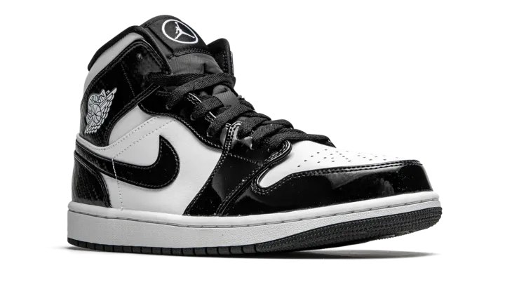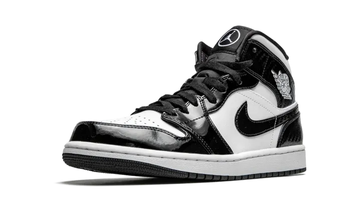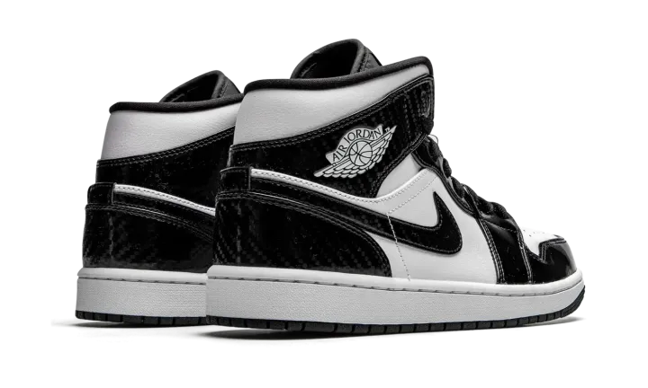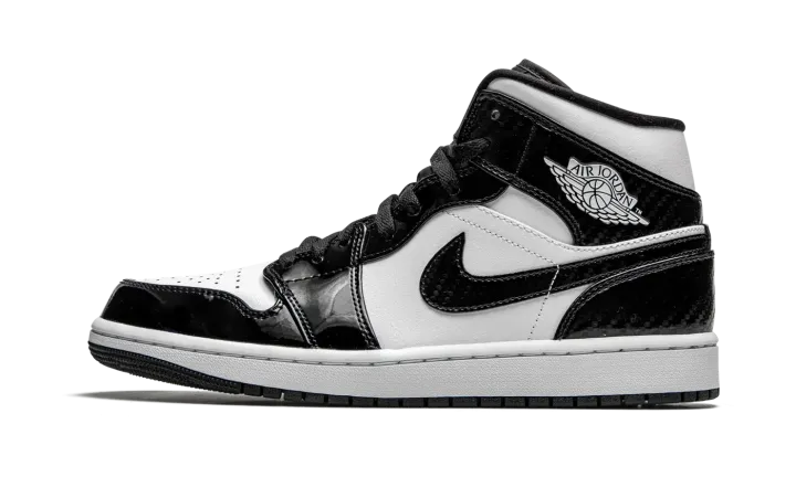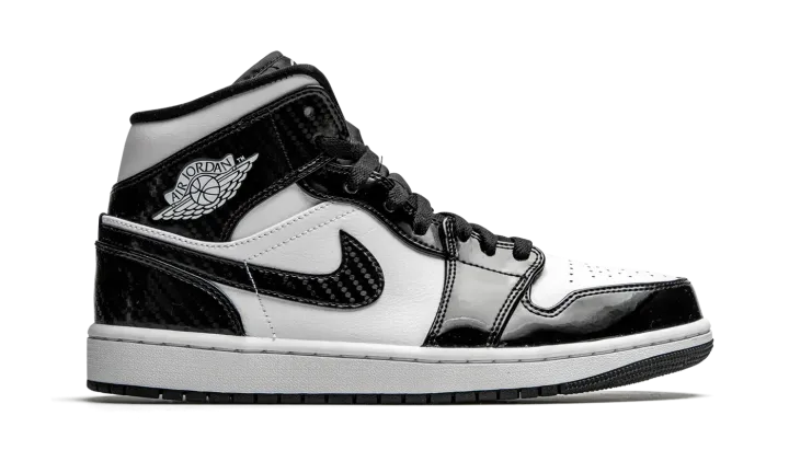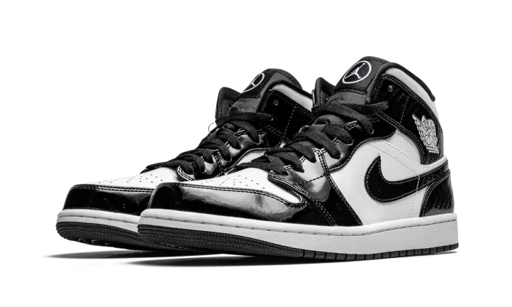 The Air Jordan 1 Mid "All-Star 2021" is a special edition of Michael Jordan's first signature shoe that is dedicated to the 2021 NBA All-Star Game. The "All-Star 2021" colorway is dressed in a two-tone white-and-black color scheme on the popular mid-top version of the Air Jordan 1. The "All-Star 2021" features a glossy black synthetic leather material across the upper with contrasting matte white panels. The black Swooshes and ankle and heel panels also feature a faux carbon fiber texture for an added dimension to the colorway. A circular "Jumpman" logo appears on the black nylon tongue. Release date: February 2021.