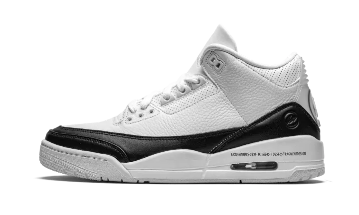 The Fragment Design x Air Jordan 3 is a collaboration between Hiroshi Fujiwara's design studio and Jordan Brand on Michael Jordan's third signature shoe. Rumored to originally be part of Fujiwara's scrapped "The 10" collection, this collaborative Jordan 3 sports a simple color scheme of black and white, though it's full of intricate details that make this one of the most appealing Jordan 3 colorways on the market. Starting with the upper, white tumbled leather appears on either side of the shoe. Smooth white leather can be found in a dotted design on both the collar and eyelets. Interestingly, Fragment removes the Jordan 3's beloved elephant print mudguard in favor of moody smooth black leather. An embossed Fragment Design logo is located on the glossy black heel panel. Moreover, a tonal embroidered Jumpman is stitched onto the white leather tongue, and Fragment's Double Bolt logo appears beneath the translucent heel overlay, which displays a traditional Jumpman emblem and black "Air" detailing. Release date: September 17, 2020.