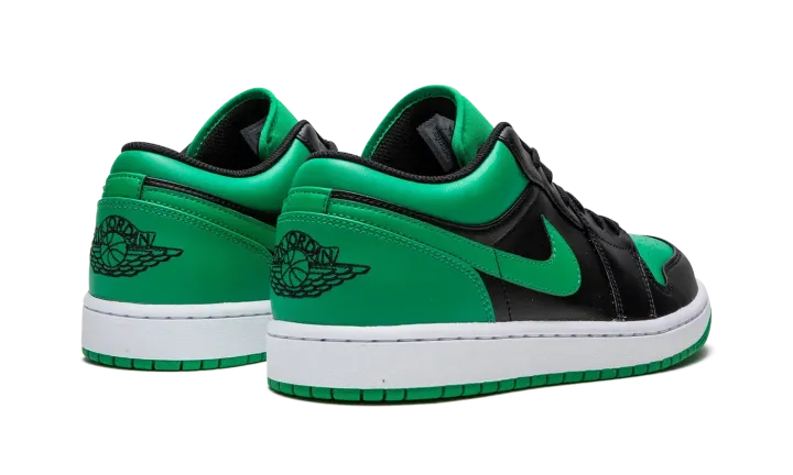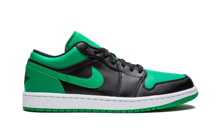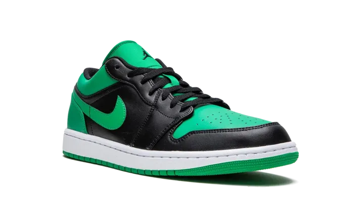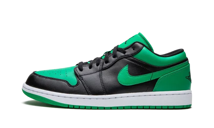 The Air Jordan 1 Low "Lucky Green" is a two-tone, black-and-green colorway of the popular sneaker from Jordan Brand's Spring 2023 collection. The "Lucky Green" Jordan 1 Low features a Lucky Green perforated leather on the toe and smooth green leather on the Swoosh and heel. Black leather is found on the overlays and on the mid-panel. A black "Wings" logo is embroidered on the heel and black Jumpman branding is stitched onto the green nylon tongue. Release date: April 11, 2023