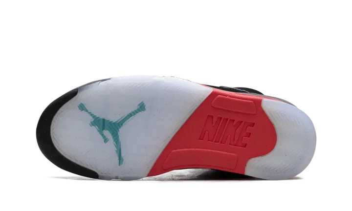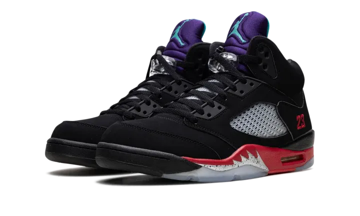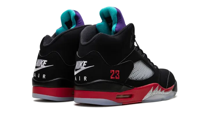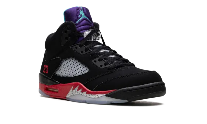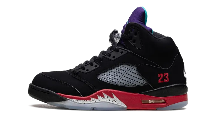 The Air Jordan 5 "Top 3" is an amalgamation of three of the most heralded colorways to have appeared on Michael Jordan's fifth signature shoe. The "Grape," "Fire Red," and "Black Metallic" all are incorporated into the design of this shoe. The upper sports a black nubuck composition taken directly from the "Black Metallic" look. Translucent netting is located on the mid-panel while the tongue is inspired by the groovy '90s-era "Grape" design. Embroidered red "23" branding on the quarter panel and embroidered white "Nike Air" detailing on the heel provide a healthy dose of nostalgia. The Air window in the heel is encased within a fiery red midsole that features cement shark tooth detailing. Jordan Brand finishes off the look with an icy translucent outsole. Release date: May 30, 2020.