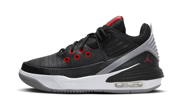 Experience the fusion of heritage and comfort with the Air Jordan Max Aura 5 'Bred'. This men's athletic sneaker, inspired by the iconic AJ3, features a timeless black, black, and University Red "Bred" colorway. Built with durable leather and textiles, it provides all-day support. The key feature is the visible Nike Air-Sole unit in the heel, delivering lightweight, responsive cushioning. It's the perfect versatile lifestyle shoe for everyday wear, giving you classic Jordan style and modern comfort.