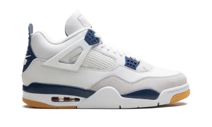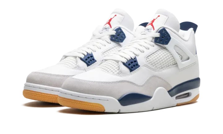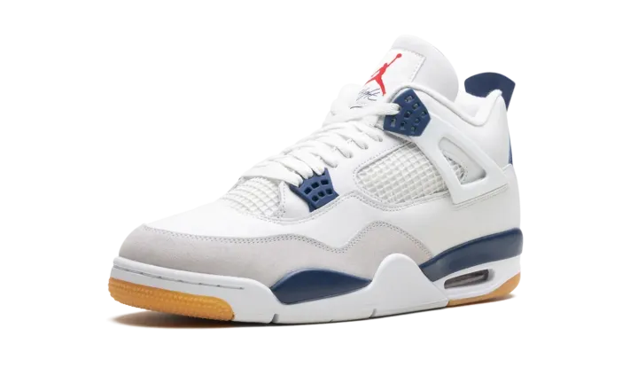 The Nike SB x Air Jordan 4 "Navy" is a new installment in the ongoing collaboration between Nike Skateboarding and Jordan Brand. The Nike SB AJ4 looks like a traditional Jordan 4 but has some unique details. Suede is placed around the toe box to make the shoe more skate-friendly. The clean navy and white upper is accented with a gum outsole, and Nike SB branding appears on the heel.