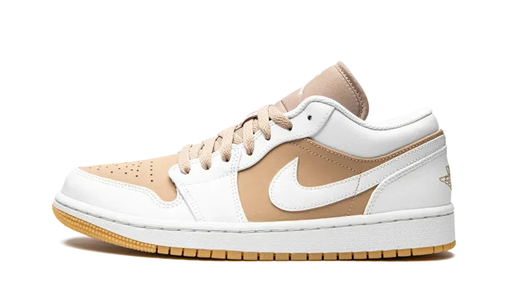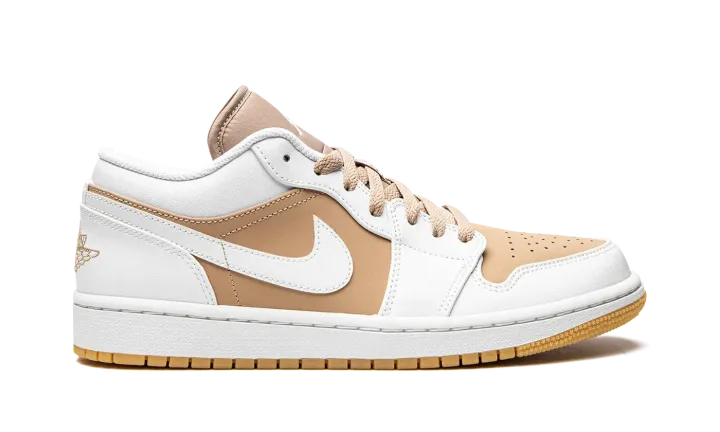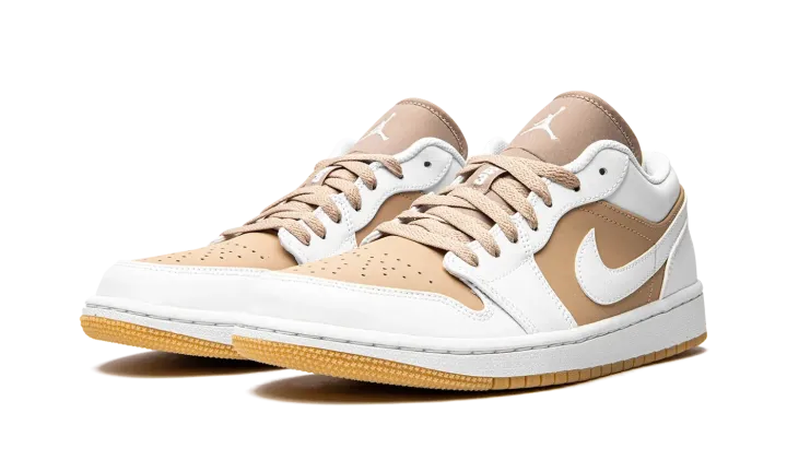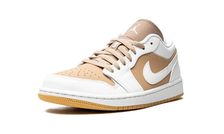 The Air Jordan 1 Low "Hemp/White" brings a clean, neutral look to the popular silhouette. This sneaker features a light brown, or "Hemp," with a leather base, coupled with white leather panels at the eyelets, toe box, and heel. A Jordan Jumpman logo is found embroidered on the heel. A white midsole and gum rubber outsole complete the shoe.