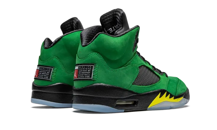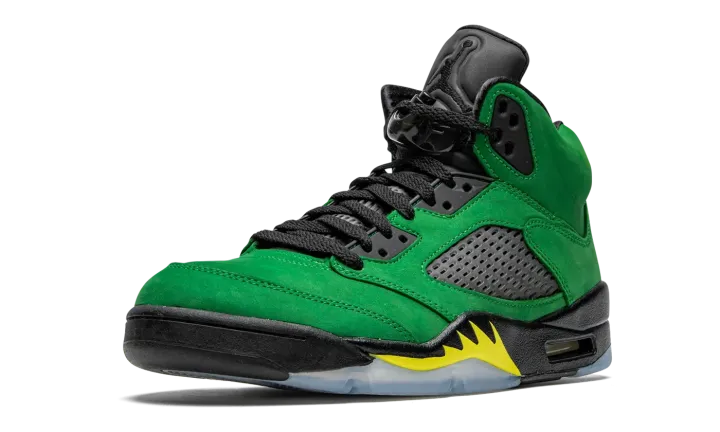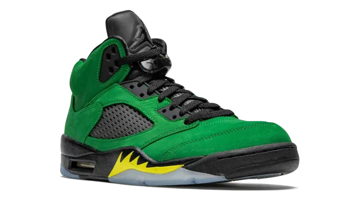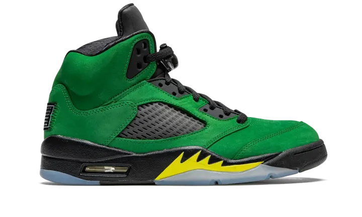 The Air Jordan 5 "Oregon" honors the Oregon Ducks as Jordan Brand celebrates the 30th anniversary of Michael Jordan's legendary fifth signature shoe in 2020. Devoid of any Ducks branding, the colorway nonetheless graciously employs the school's familiar green, yellow, and black color scheme. Save for the smoky translucent netting found on the mid-panel and tongue, the entire upper is cast in green suede for a bold and unique appearance. Additional styling includes black laces, a semi-translucent lace lock with Jumpman detailing, and embroidered "Team Jordan" patch on the heel. The black leather tongue displays a tonal embossed Jumpman logo and the black rubber midsole features yellow accented shark tooth detailing on top of an icy blue translucent outsole. Release date: September 12, 2020.