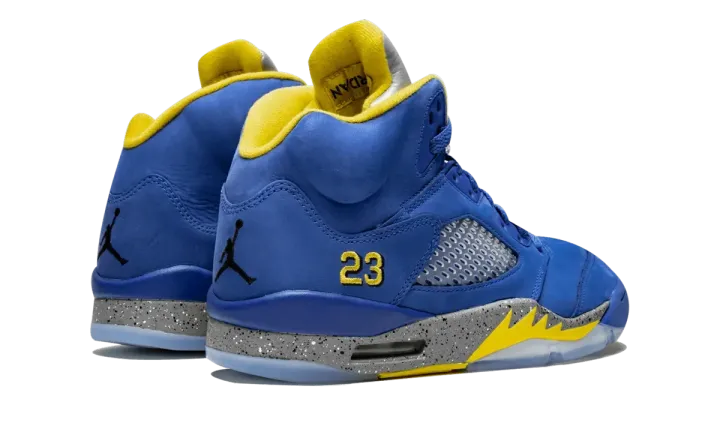 The Air Jordan 5 JSP "Laney Varsity Royal" is a continuation of the original "Laney" colorway for the Jordan 5 that is inspired by the team colors of Michael Jordan's high school, Emsley A. Laney in Wilmington, North Carolina. Originally released in 2000 as one of the first non-OG colorways of the Air Jordan 5, the "Laney" theme returned in 2019 with a Varsity Royal nubuck upper with yellow accents and a grey speckled midsole. The remix of the original "Laney" AJ5 is completed with reflective silver tongues. The chenille Jumpman logos are a reference to traditional high school varsity jackets. The Air Jordan 5 JSP "Laney Varsity Royal" released in January 2019.