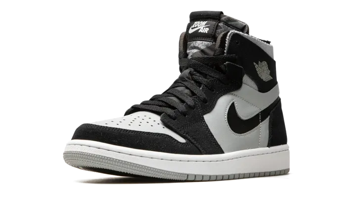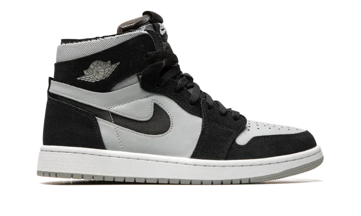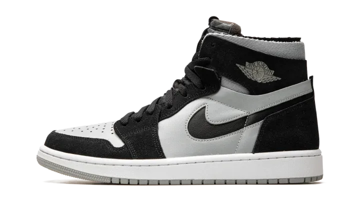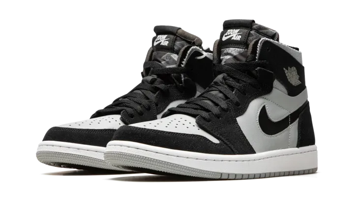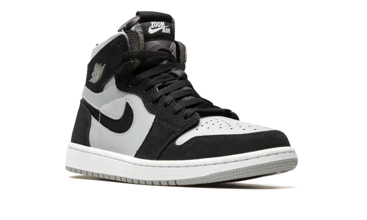 The Air Jordan 1 Zoom CMFT "Black/Grey" is a versatile colorway of the modified version of the classic basketball and lifestyle shoe. The Jordan 1 Zoom Comfort is a modern alternative to the standard Jordan 1 High OG model that features a "do-it-yourself" inspired design with Nike's signature Zoom Air cushioning technology in its midsole. Here, on the "Black/Grey," the Jordan 1 Zoom Comfort features a Light Smoke Grey leather base with contrasting black suede overlays. A cut-out black suede Swoosh appears on the sides. Grey "Wings" branding is found on the collar. A "Zoom Air" logo appears on the tongue tag. Exposed foam padding on the tongue and a frayed collar help give the Jordan 1 Zoom Comfort a contemporary look.