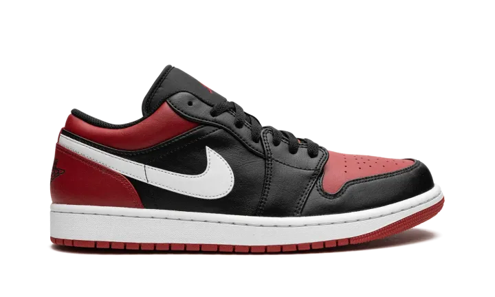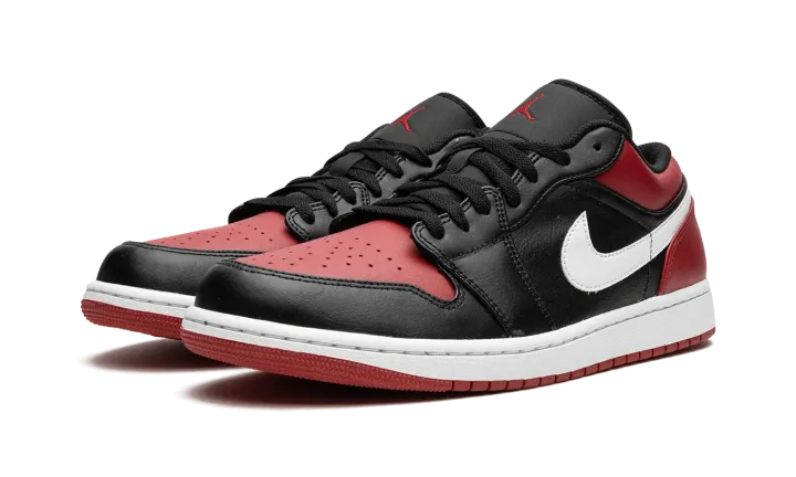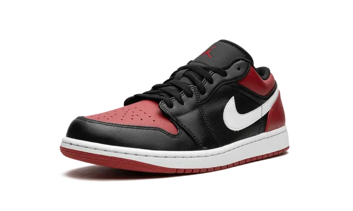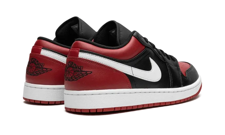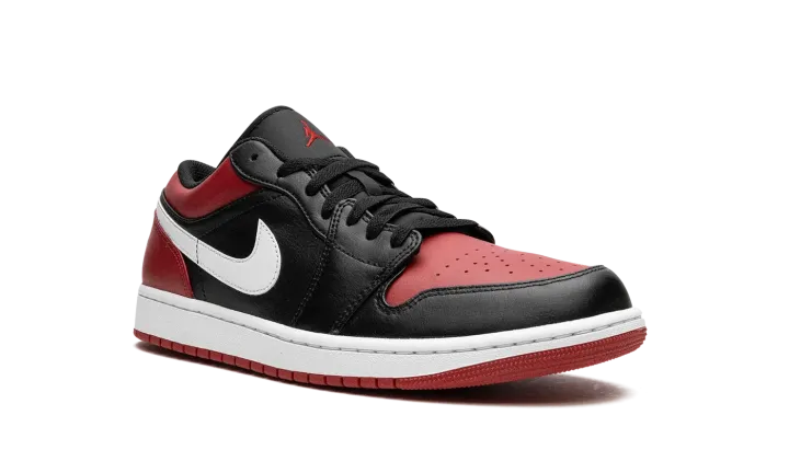 The Air Jordan 1 Low "Alternate Bred Toe" is a colorway of the classic retro basketball and lifestyle shoe that updates one of its original designs. The OG Jordan 1 "Bred Toe" was originally released in 1985 and was worn by Michael Jordan with the Chicago Bulls. On the "Alternate Bred Toe," the colorway is re-engineered with a few noticeable updates. The shoe features a Gym Red leather perforated toe with contrasting black leather overlays on the toe cap, forefoot, and eyelets. Black leather also appears on the mid-panel under a white leather Swoosh. Gym Red leather appears on the collar and heel. "Wings" branding is on the back of the shoe and a Jumpman is found on the tongue. Release date: March 19, 2023