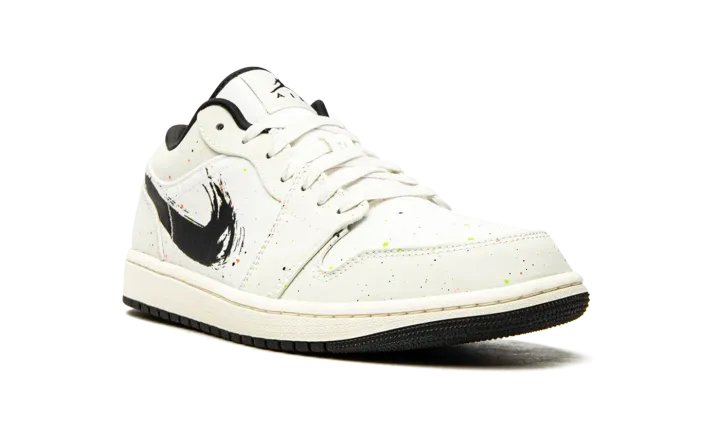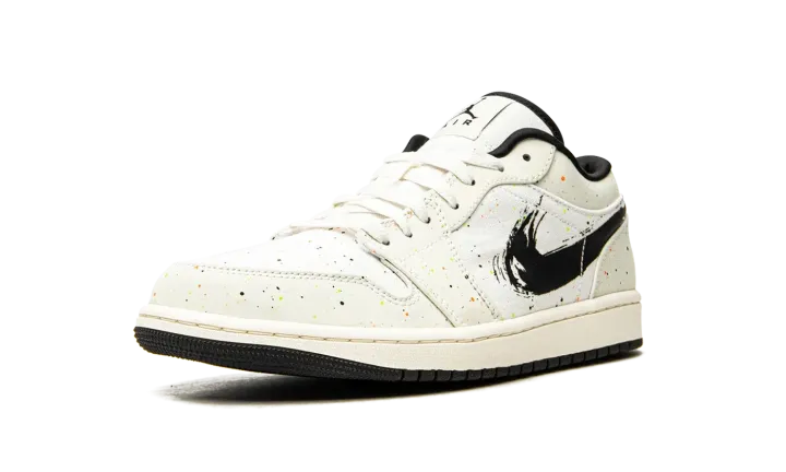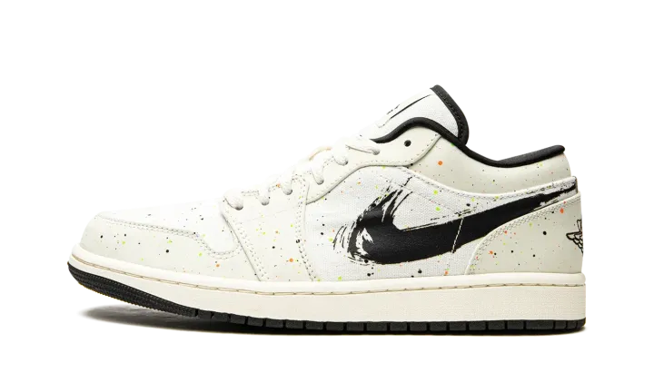 The Air Jordan 1 Low SE "Brushstroke" is a creative look for Michael Jordan's first signature shoe in its low-top silhouette that culls design inspiration from artists. The "Brushstroke" colorway also appears on the Air Jordan 1 Mid, as well, and was one of the most popular styles for the Jordan 1 in 2021. The upper combines Sail-colored canvas and leather on the toe and mid-panel, and overlays, respectively. Each panel displays multicolor paint speckles. A black Swoosh appears on the sides in a brushstroke-style design and a classic "Wings" logo is embroidered on the heel. Other details include a black Jumpman with "Air" branding on the tongue, a cream-colored rubber midsole, and black outsole.