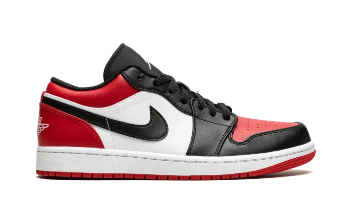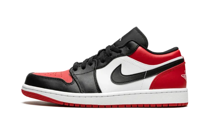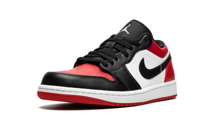 The Air Jordan 1 Low "Bred Toe" looks both the Chicago Bulls and an original colorway of Michael Jordan's first signature shoe for design inspiration. Dressed in the team uniform colors of Jordan's former basketball team, this low-top variation of the vintage basketball shoe replicates the color block of the original "Black Toe" Jordan 1 worn by Jordan during his rookie season, with a twist. Instead of a white leather perforated toe as seen on the original, the modern "Bred Toe" has a Gym Red perforated toe with contrasting black leather overlays on the toe cap, forefoot, and eyelets. Elsewhere, white leather appears on the mid-panel and Gym Red leather is found on the collar and heel. A black leather Swoosh resides on both sides and a white "Wings" logo is embroidered onto the heel. The black nylon tongue features a white Jumpman and black "23" branding is found on the lace overlay.