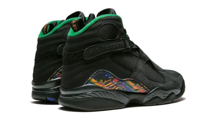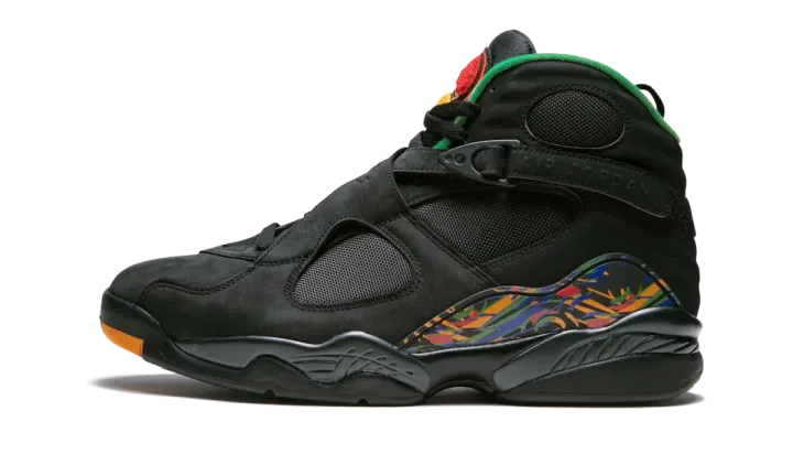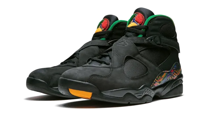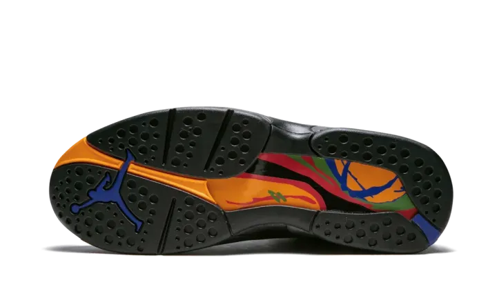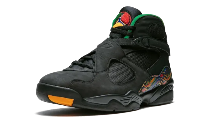 The Air Jordan 8 "Air Raid" is a special colorway of the Michael Jordan's eighth signature shoe that is inspired by the Nike Air Raid II. The Air Jordan 8 borrowing the Air Raid II's color scheme is fitting, as the two shoes share design details, most notably the crossing straps across the upper. Both models were also designed by legendary Nike designer Tinker Hatfield. The "Air Raid" Jordan 8 colorway features a black nubuck upper with ballistic nylon panels and multicolor accents throughout the shoe inspired by the "Peace" colorway of the Air Raid II. The Air Jordan 8 "Air Raid" released in December 2018.