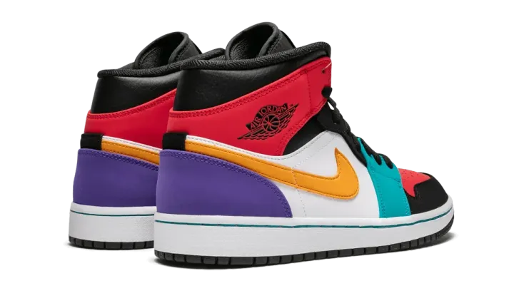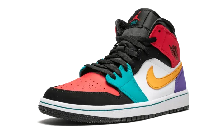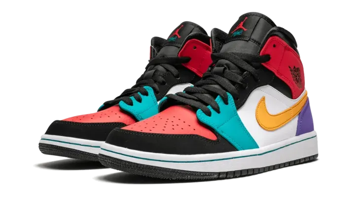 The Air Jordan 1 Mid receives multi-color treatment with this unique colorway. For this 2019 release, Jordan Brand covered the mid-top Jordan 1 in a wide array of eye-catching colors like red, teal, orange, and purple. The bright shades all accent a toned-down base layer composed of black nubuck and white leather.