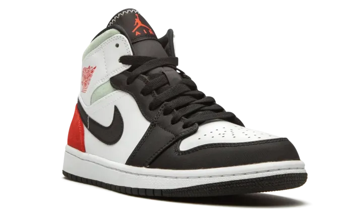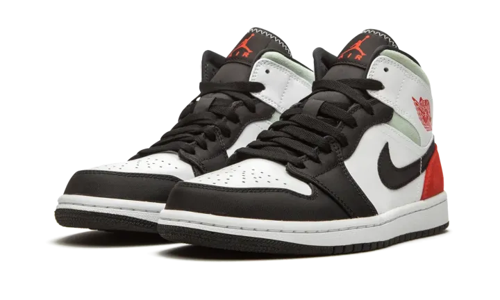 The Air Jordan 1 Mid "Red/Grey/Black Toe" rearranges the color scheme of the original "Black Toe" colorway of Michael Jordan's first signature shoe in mid-top form. Slimmed down to mid-top height, this Jordan 1 features a familiar color scheme employed by some of the most coveted shoes in Jordan Brand history. A medley of materials appear on various panels across the upper. White leather forms the base and can be found on the perforated toe, mid-panel, and collar overlay. Against the white base, the black nylon overlays on the forefoot, toe cap, and eyelets are reminiscent of the color block of the original "Black Toe" Jordan 1. Branding details include a black nylon Swoosh on either side, a red "Wings" emblem on the collar, and a red accented Jumpman logo on the black nylon tongue tab. Fiery red suede is located on the heel with grey suede appearing on the collar.
