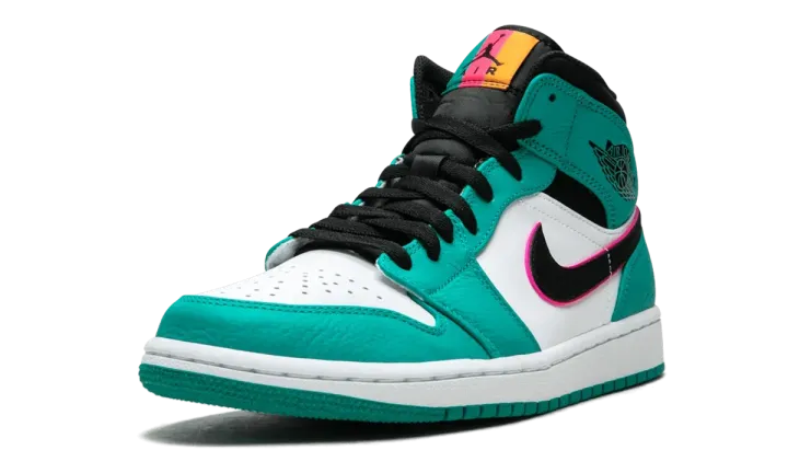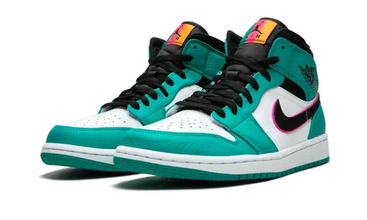 The Air Jordan 1 Mid "South Beach" from 2018 gives a tropical look to the iconic silhouette. This version of the mid-top Jordan 1 adds some Miami vibes to the classic model with a Turbo Green and white leather upper that is accented with black and hot pink. A striped Jumpman logo tag on each tongue adds the finishing touch to the colorful Air Jordan 1 Mid "South Beach."