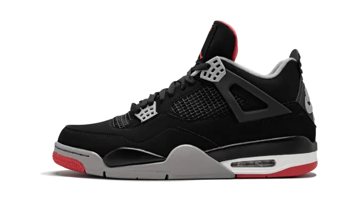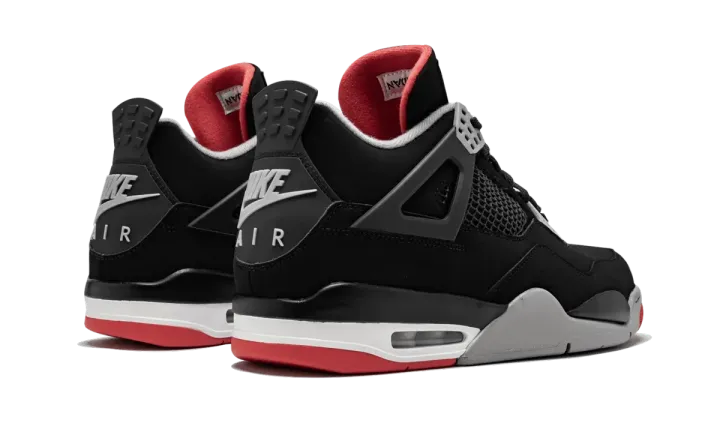 This Air Jordan 4 "Bred" is the 2019 retro of the iconic colorway of Michael Jordan's fourth signature shoe. The famous black and red version of the Jordan 4 returned in the spring of 2019 with its original "Nike Air" branding on the heel for the first time since its first retro release in 1999. Now 20 years after that first retro and 30 years after its initial 1989 release, the "Bred" Air Jordan 4 looks just as outstanding as ever. This true-to-OG retro features a black Durabuck (synthetic nubuck) upper with grey, red, and white accents throughout. In addition to the large Nike Air logo on the heel tab, the original Nike branding is also present on the outsole and sockliner. The Air Jordan 4 "Bred" released on May 4, 2019.
