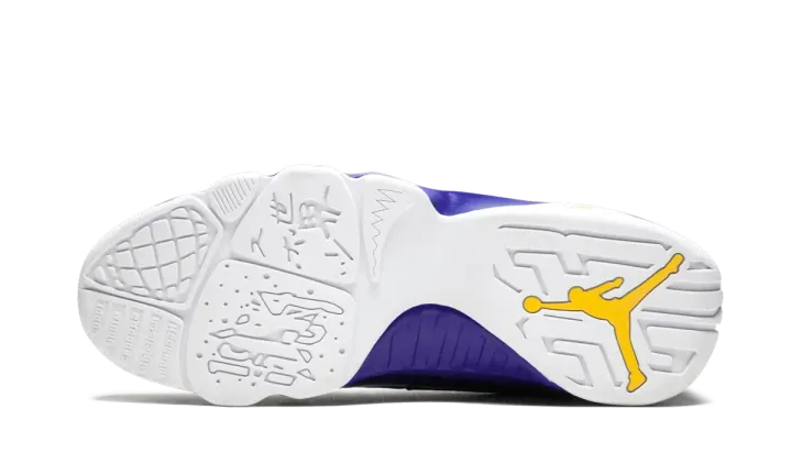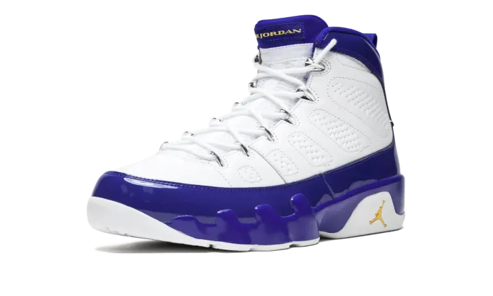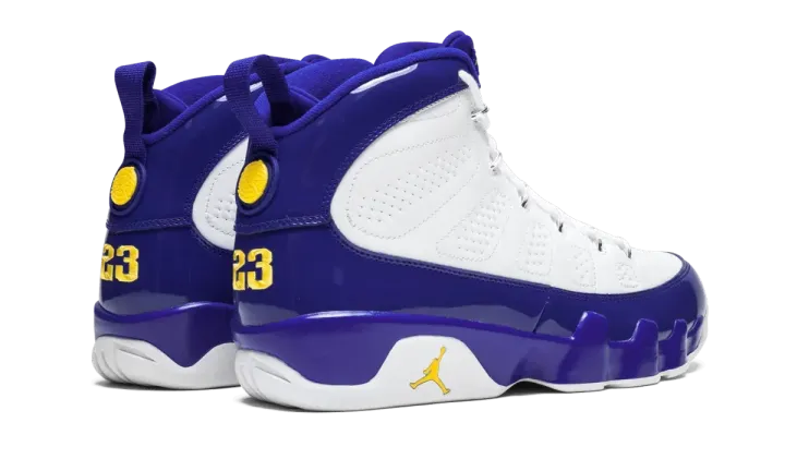 The Air Jordan 9 Retro is the first ever release for the brand in Lakers colors, featuring a strong purple on the patent leather mixed with gold accents. In an interesting twist, however, Jordan Brand chooses to go with "23", Michael's old number, instead of the "8" worn by Kobe Bryant.