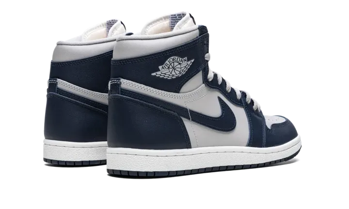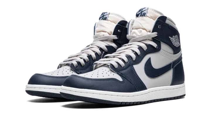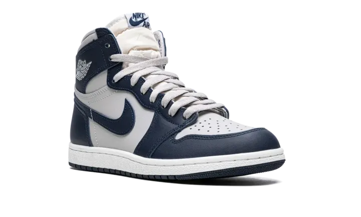 The Air Jordan 1 High '85 "Georgetown" is a colorway of Michael Jordan's first signature shoe that shows appreciation to the Georgetown Hoyas, the college basketball team Jordan famously defeated to earn his first NCAA Championship in 1982. The Jordan 1 High '85 "Georgetown" is a near one-to-one remake of the original Air Jordan 1 High from 1985, as it features an accurate-to-original collar height and shape and panel placement, and upgraded materials. Specifically, the "Georgetown" colorway appears in the same color block as the Hoyas' team uniforms, with Tech Grey leather on the perforated toe, mid-panel, and collar, and contrasting College Navy leather on the overlays and Swoosh branding. A Summit White "Wings" logo appears on the collar and classic "Nike Air" detailing is found on the tongue tag. It all rests on a white midsole and navy blue outsole. The Air Jordan 1 High '85 "Georgetown" joins the "Neutral Grey," "Varsity Red," and "New Beginnings" colorways in the Jordan 1 High '85 collection that honors the legacy of the vintage basketball shoe with retro-inspired design elements. Release date: April 2, 2022