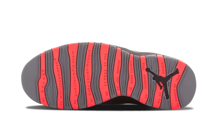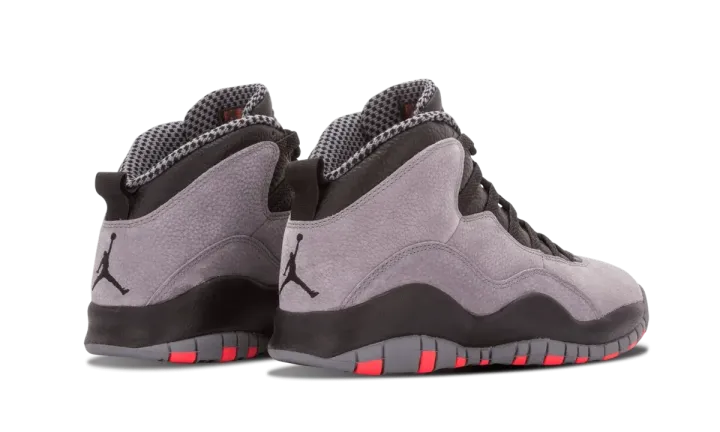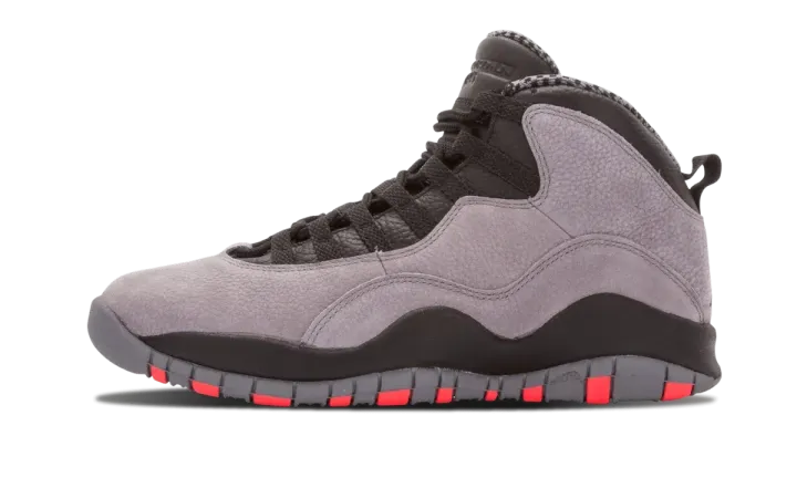 This release of the Air Jordan 10 from 2014 features the shoe in one of its most appealing new colorways ever. The soft nubuck upper is presented in shades of grey, while black leather adds detailing and hits of red highlight the iconic outsole design. The final product is somewhere in between the original "Shadow" and "Chicago" colorways for a clean and easily wearable look.