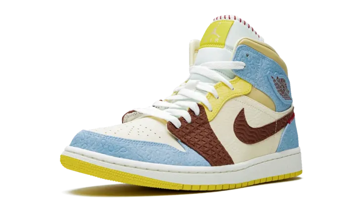 The Maison Chateau Rouge x Air Jordan 1 Mid "Fearless" is the Paris-based brand's vision of the mid-top version of Michael Jordan's first signature shoe. Maison Chateau Rouge is known for their African-inspired apparel for men and women and the collective applies its trademark designs liberally to the upper of the silhouette, via textured leather paneling. A tan leather base can be found on the mid-panel, perforated toe, and ankle collar, while dark brown textured leather covers the forefoot panel and Swoosh. Light blue debossed leather covers the toe, ankle collar and heel. Red exposed stitching outlining the tongue and at the heel enhances the hand-constructed theme of the shoe. Release date: November 30, 2019.