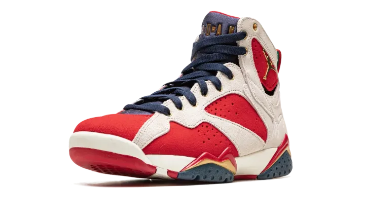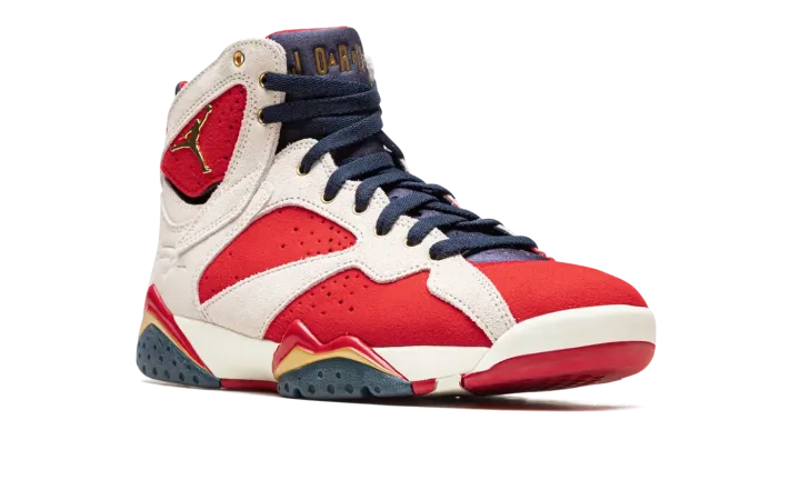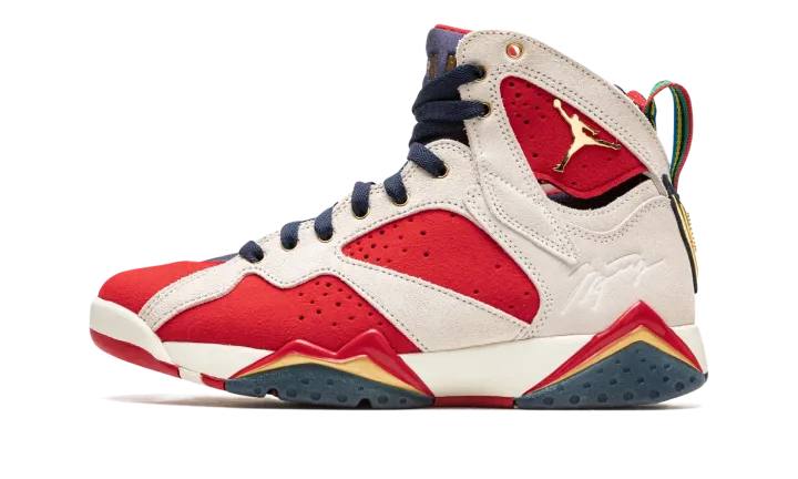 The Trophy Room x Air Jordan 7 "New Sheriff in Town" is a collaboration between Marcus Jordan's sneaker boutique and Jordan Brand on his father's seventh signature shoe. Dressed in a decidedly "USA" inspired look, the Jordan 7 "New Sheriff in Town" by Marcus Jordan and Trophy Room references the famous quote Michael had for Dream Team teammates Magic Johnson and Larry Bird during a Dream Team practice. It also riffs on the Jordan 7's "Olympic" colorway that was worn by Jordan on the '92 Dream Team. As for its design, the "New Sheriff in Town" features a True Red suede base with cream suede overlays. Michael Jordan's signature is debossed on the lateral side of the heel and a Metallic Gold Jumpman emblem appears on the collar. Additional gold accenting is found on the Gold Medal-inspired heel tabs. Release date: November 5, 2022